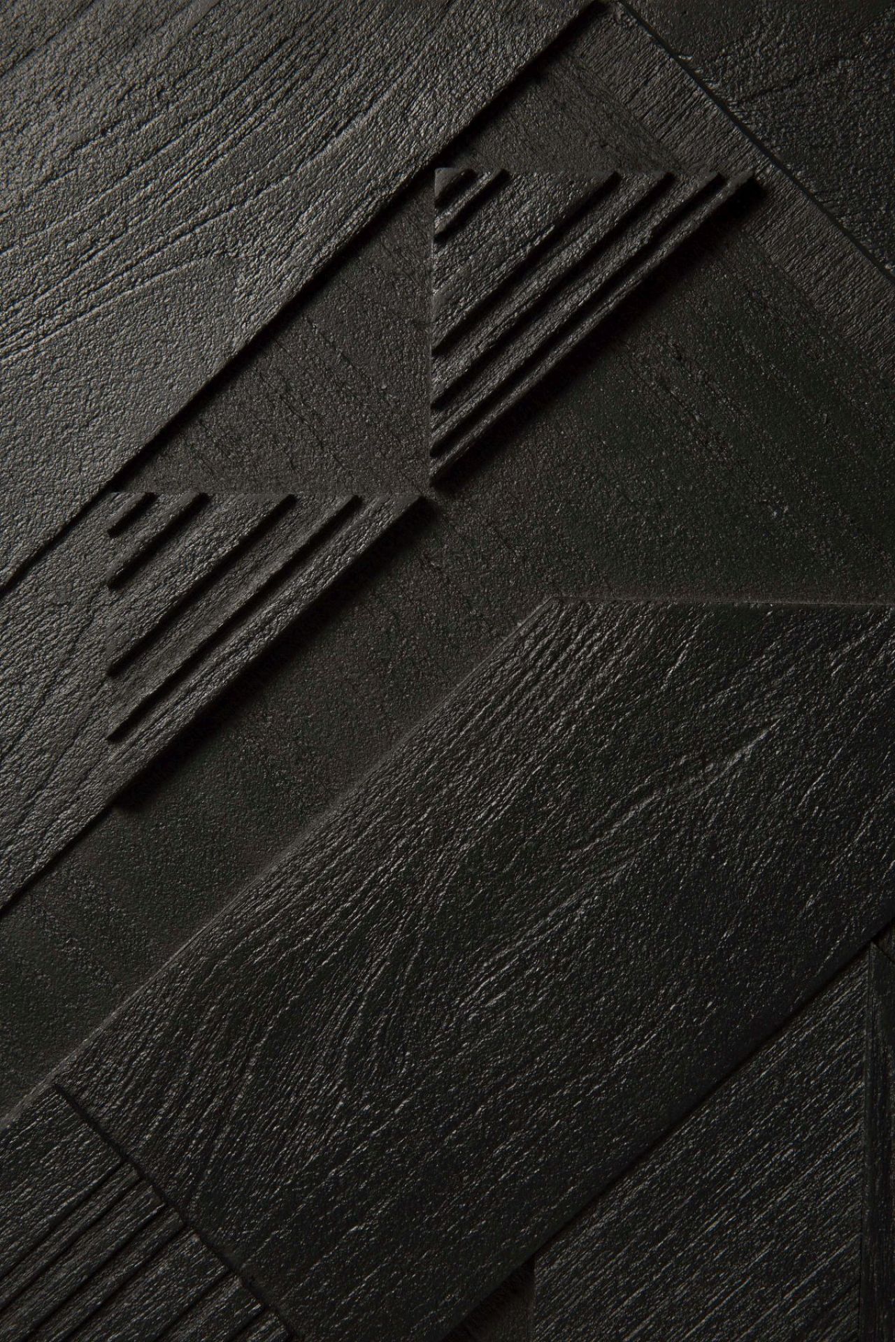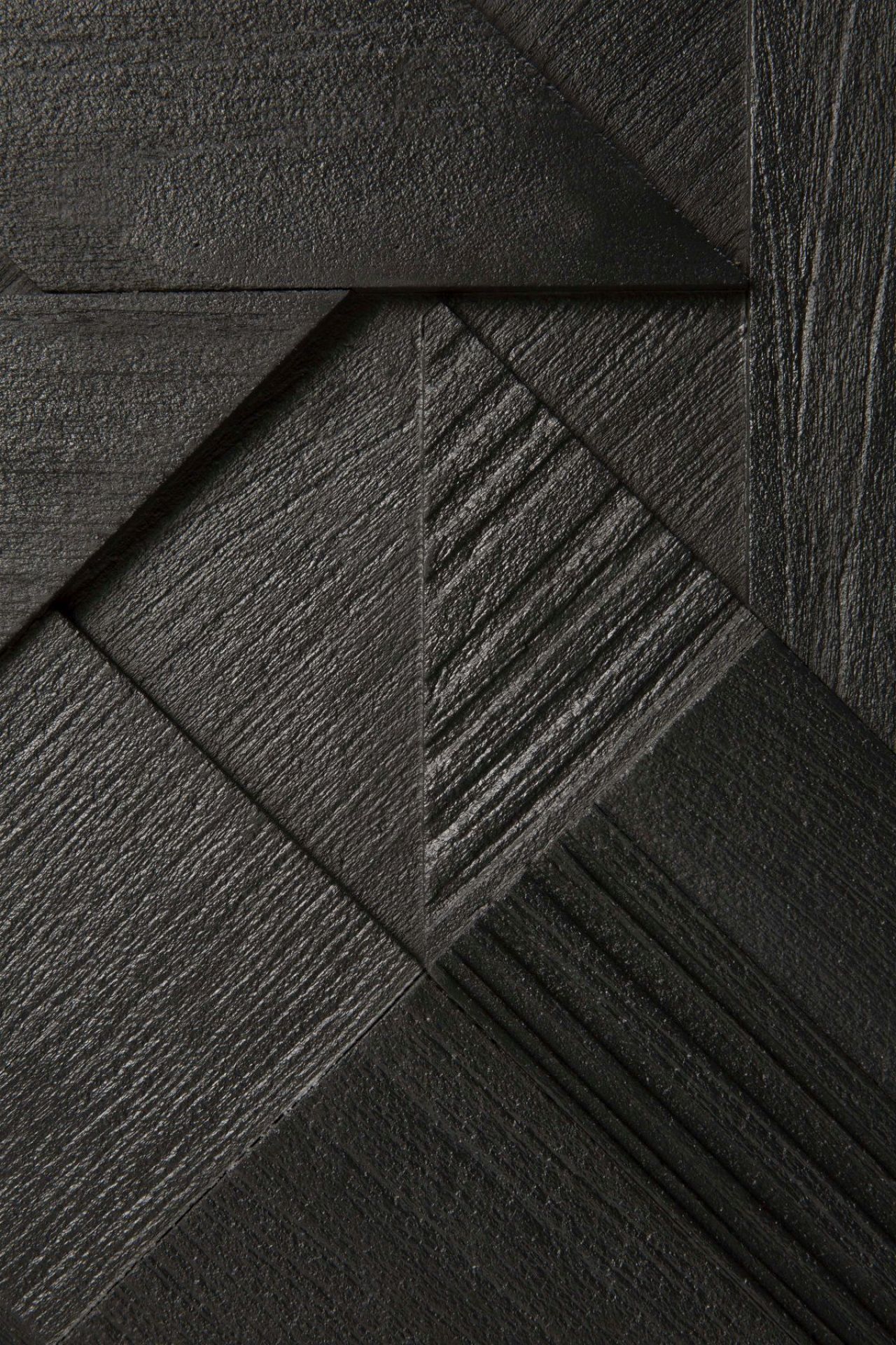 Als Grundlage für das Muster dient ein Dreieck, das verschieden platziert und repliziert wird. Die Verwendung mehrerer Schichten sorgt für ein komplexes Gefühl von Tiefe und Dynamik und lässt die Fronten des Schranks geradezu beweglich erscheinen. Das unkonventionelle Design macht das Graphic TV-Möbel von Ethnicraft zu einem absoluten Hingucker.
