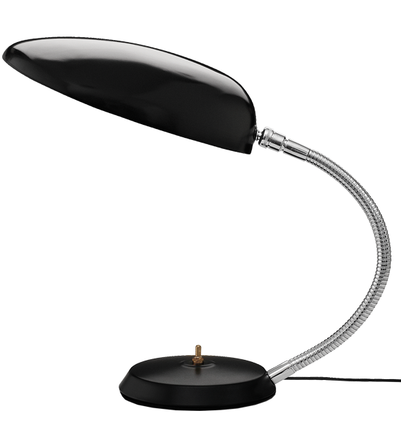 Die Cobra Tischleuchte, entworfen von Designerin Greta M. Grossman, verdankt ihren Namen der Form ihres Halses, welcher an eine Schlange erinnert. Der flexible Arm kann in alle Richtungen gebogen werden, während sich der Schirm um 360 Grad drehen lässt.