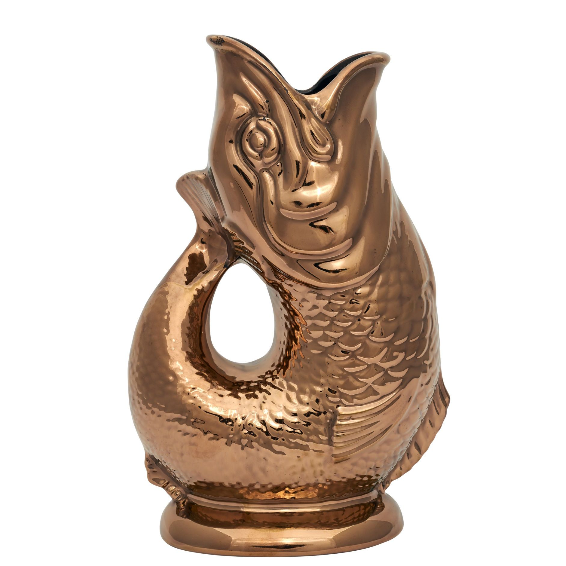 Nach der Schließung der Dartmouth Pottery im Jahr 2002 hatte Wade Ceramics die Möglichkeit, die Form für den fischförmigen Krug zu erwerben. Seitdem stellt das Unternehmen die Gluckigluck Karaffen weiterhin her und bewahrt so die Tradition und den Charme dieser einzigartigen Krüge.