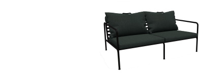 Avon 2-Sitzer Sofa von Houe für den Außenbereich mit dunklen Kissen und schwarzem Metallgestell.