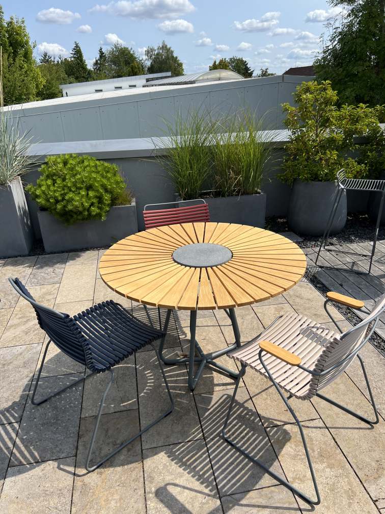 Click Position Chair von Houe: Outdoor Sessel mit schwarzen Lamellen und Holzarmlehnen.