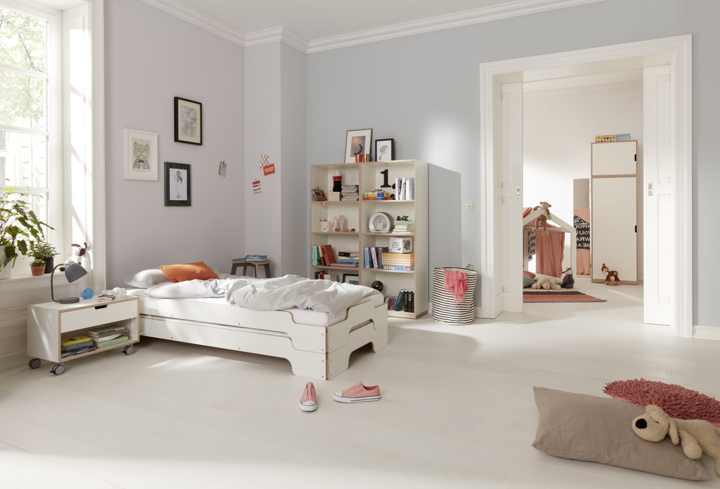 Weiße Stapelliege von Müller Möbelwerkstätten mit Komfortmatratze, modernes Design für Kinder- und Jugendzimmer.