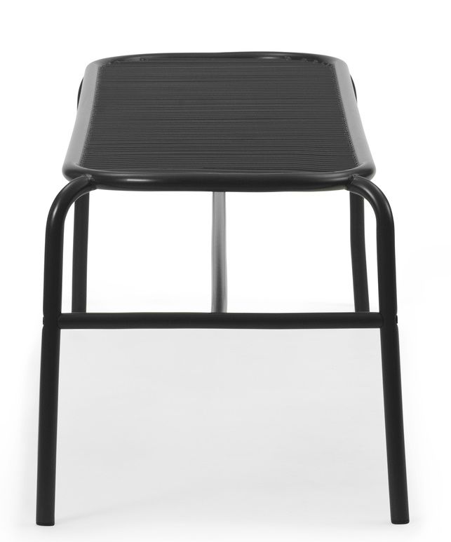 Normann Copenhagen Vig Bank für den Außenbereich, schwarzes Metallgestell und gerippte Sitzfläche, Frontansicht.