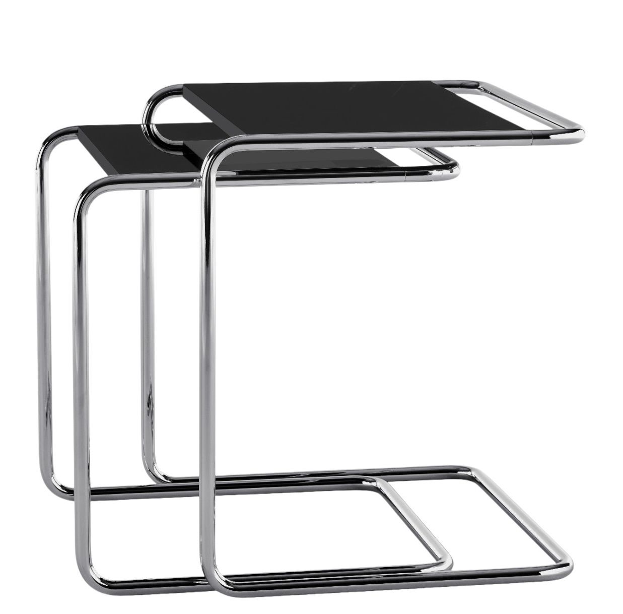 Zwei JS. Thonet B97 Beistelltische mit schwarzer Platte und verchromtem Stahlrohrgestell. Moderner Designklassiker.