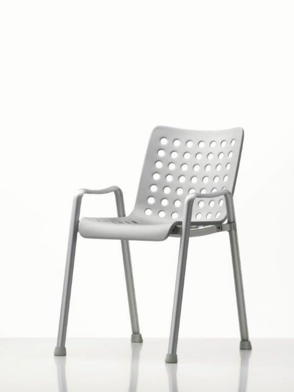 Silberner Landi Stuhl mit Armlehnen und gelochter Rückenlehne, ein moderner Designklassiker für Wohnen und Büro.