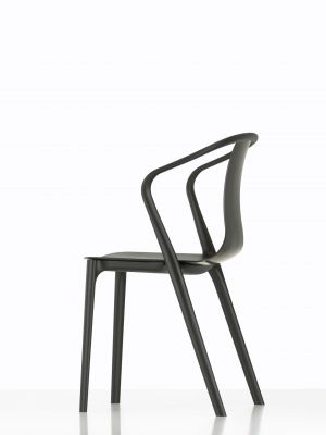 Schwarzer Belleville Armchair Plastic Stuhl von Vitra, Seitenansicht auf weißem Hintergrund. Designstuhl mit Armlehnen.