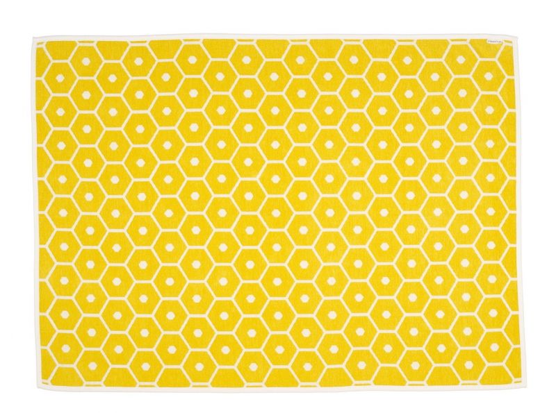 Wie Honigwaben setzt sich das Muster des Honey Teppichs von Pappelina fort. Im schwedischen Leksand an traditionellen Webstühlen gefertigt, ist der Kunststoffteppich echte Handarbeit.  In der gelben Variante wird der Eindruck von Honigwaben noch zusätzlich verstärkt, aber auch die anderen Farben machen eine gute Figur.