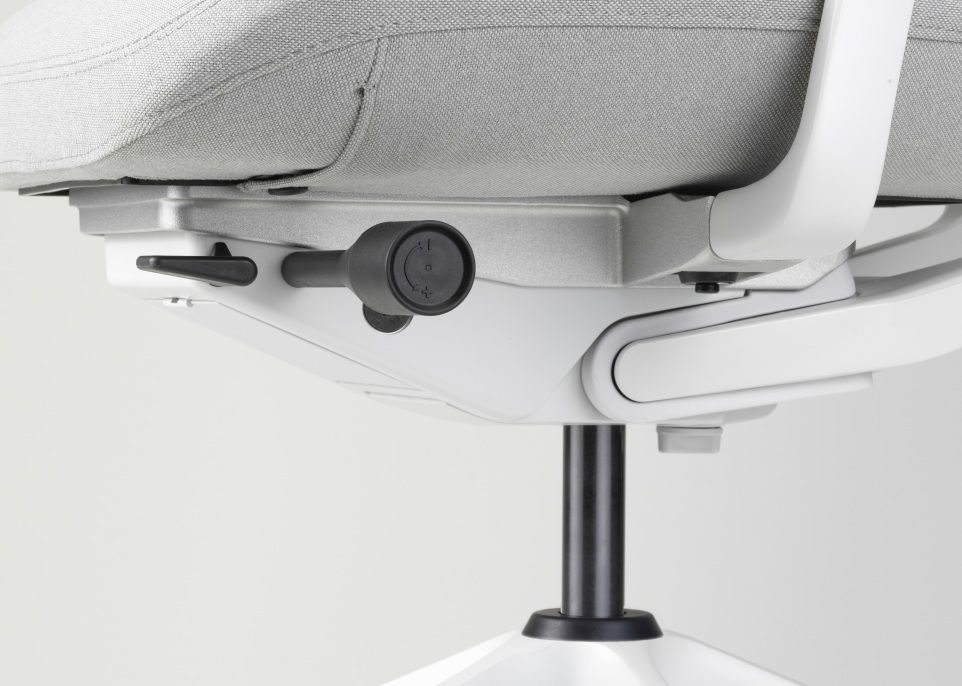 Der Stuhl verfügt über eine Flow-Motion Mechanik und ist in aufrechter Sitzposition arretierbar. Die Rückenlehnen-Gegenkraft und die Vorwärtsneigung kann individuell angepasst werden.