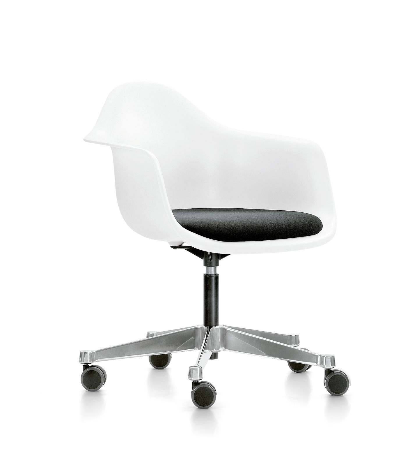 Die große Auswahl an Untergestellen lässt die Eames Plastic Chairs zu echten Allrounder werden. Der Eames Plastic Armchair PACC verfügt über ein höhenverstellbares Drehuntergestell – perfekt für das Büro!
