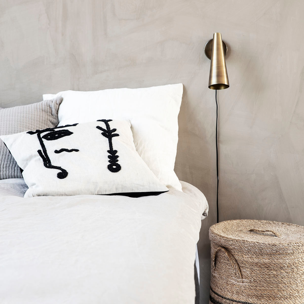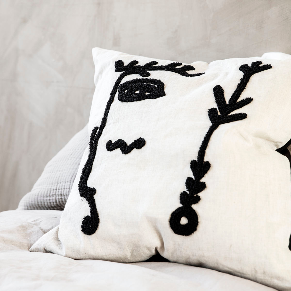 Der einzigartige Look des wunderschönen Kissenbezugs macht das Ingo Pillowcase zu einem modernen und ansprechenden Wohnaccessoire. Die helle, beige Farbe des Bezugs steht im Kontrast zu der schwarzen Silhouette eines Frauengesichts, die das Kissen ziert.