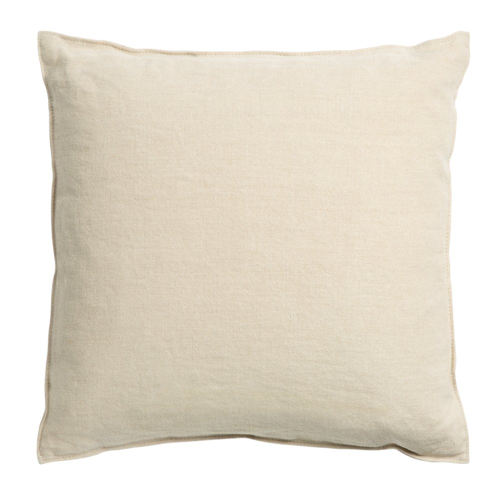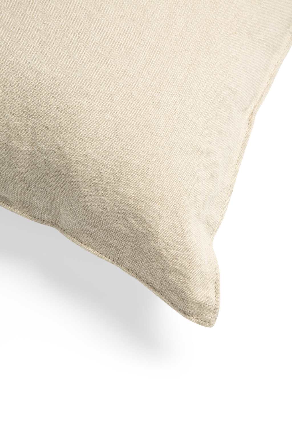 Der Kissenbezug besteht aus 100 % Leinen. Die Baumwoll-Kissenhüllen sind mit 100 % Entendaunen, die zu 50 % aus recycelten Daunen bestehen, gefüllt. Das Kissen ist 50 cm breit, 50 cm tief und 15 cm hoch.