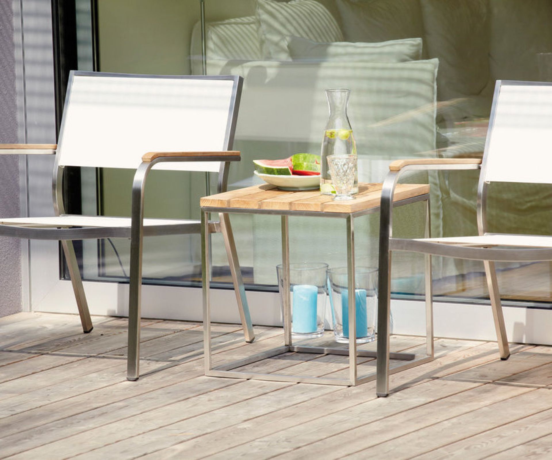 Das Gestell von Lux ist aus geschliffenem Edelstahl gefertigt. Die Ablage bzw. Sitzfläche besteht aus 22 mm starken Leisten aus Teak. Das Holz ist besonders witterungsbeständig und entwickelt mit der Zeit eine silbergraue Patina. Durch die regelmäßige Behandlung mit Teak-Öl können Sie diesen Prozess herauszögern. Lux ist 37 cm hoch, 120 cm breit und 44 cm tief.
