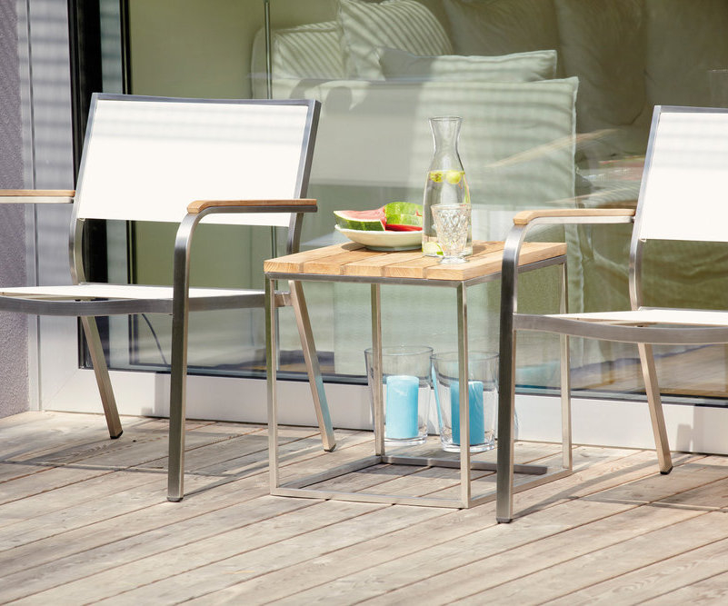 Das Gestell von Lux ist aus geschliffenem Edelstahl gefertigt. Die Ablage bzw. Sitzfläche besteht aus 22 mm starken Leisten aus Teak. Das Holz ist besonders witterungsbeständig und entwickelt mit der Zeit eine silbergraue Patina. Durch die regelmäßige Behandlung mit Teak-Öl können Sie diesen Prozess herauszögern. Lux ist 44 cm hoch, 45 cm breit und 45 cm tief.