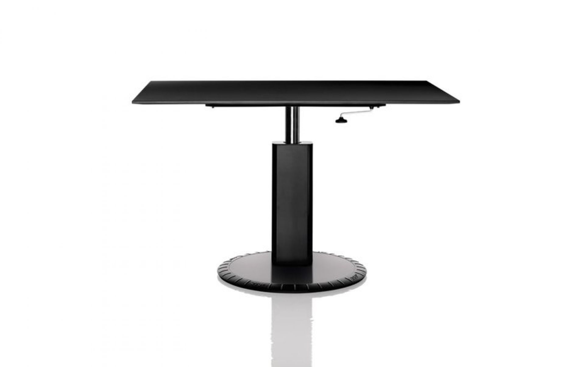 Magis 360° Table von Konstantin Grcic. Höhenverstellung funktioniert pneumatisch. Fuß aus Aluminium-Druckguss. Gestell aus Profilaluminium, Stützen aus Profilstahl. Tischplatte aus schwarz lackiertem MDF. Stärke 2, 2 mcm. Breite 140 cm, Tiefe 90 cm, Höhe verstellbar zwischen 73 cm und 95 cm, der Fuß-Durchmesser beträgt 70 cm.