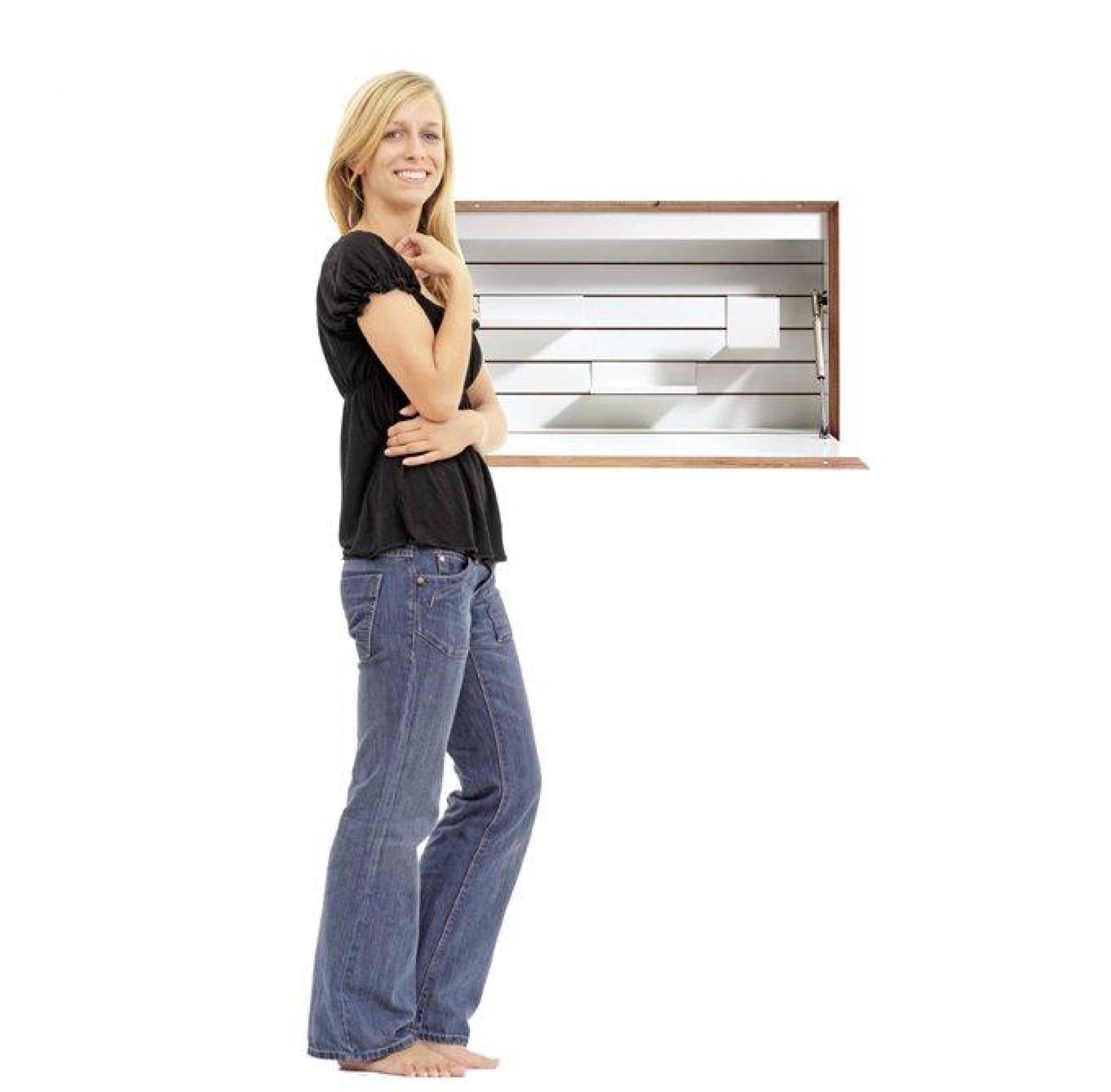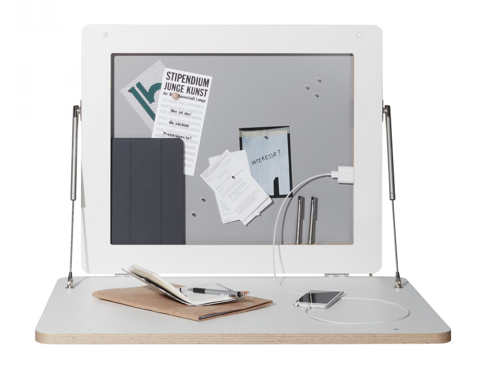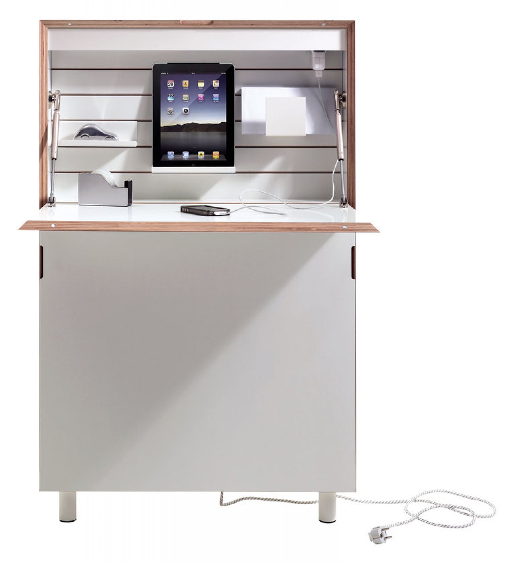 Flatbox Sekretär von Müller Möbelwerkstätten, geöffnet, mit Laptop, Handy und Zubehör. Wandsekretär, platzsparend.