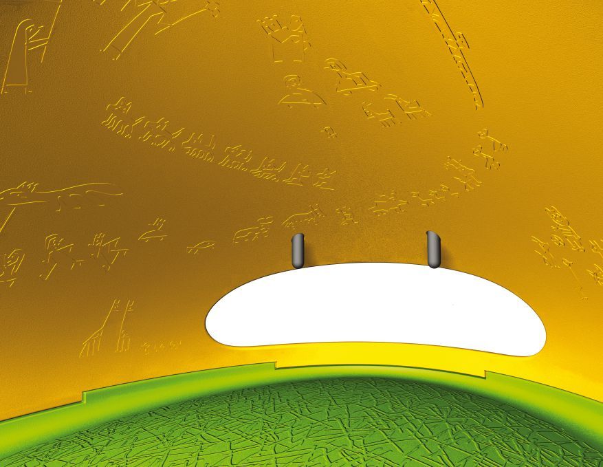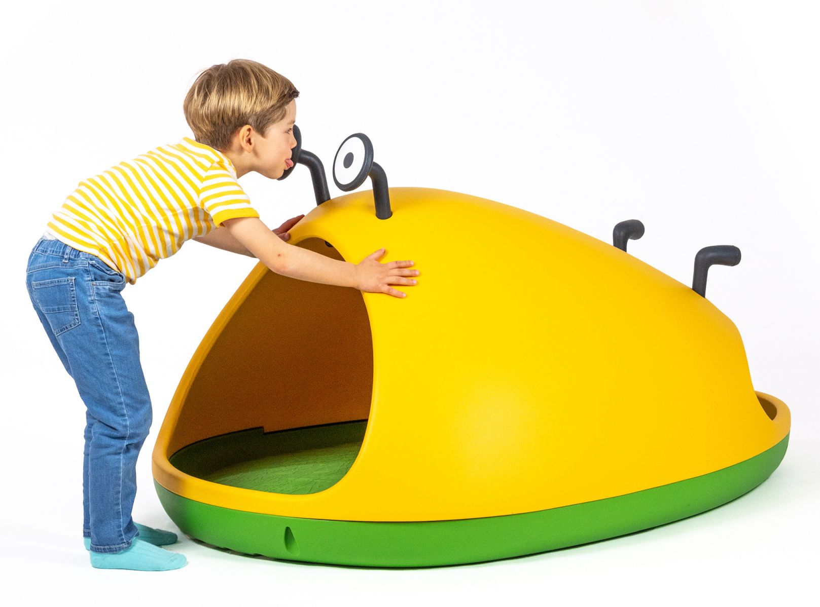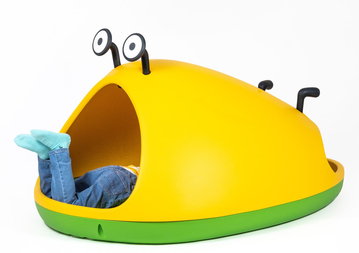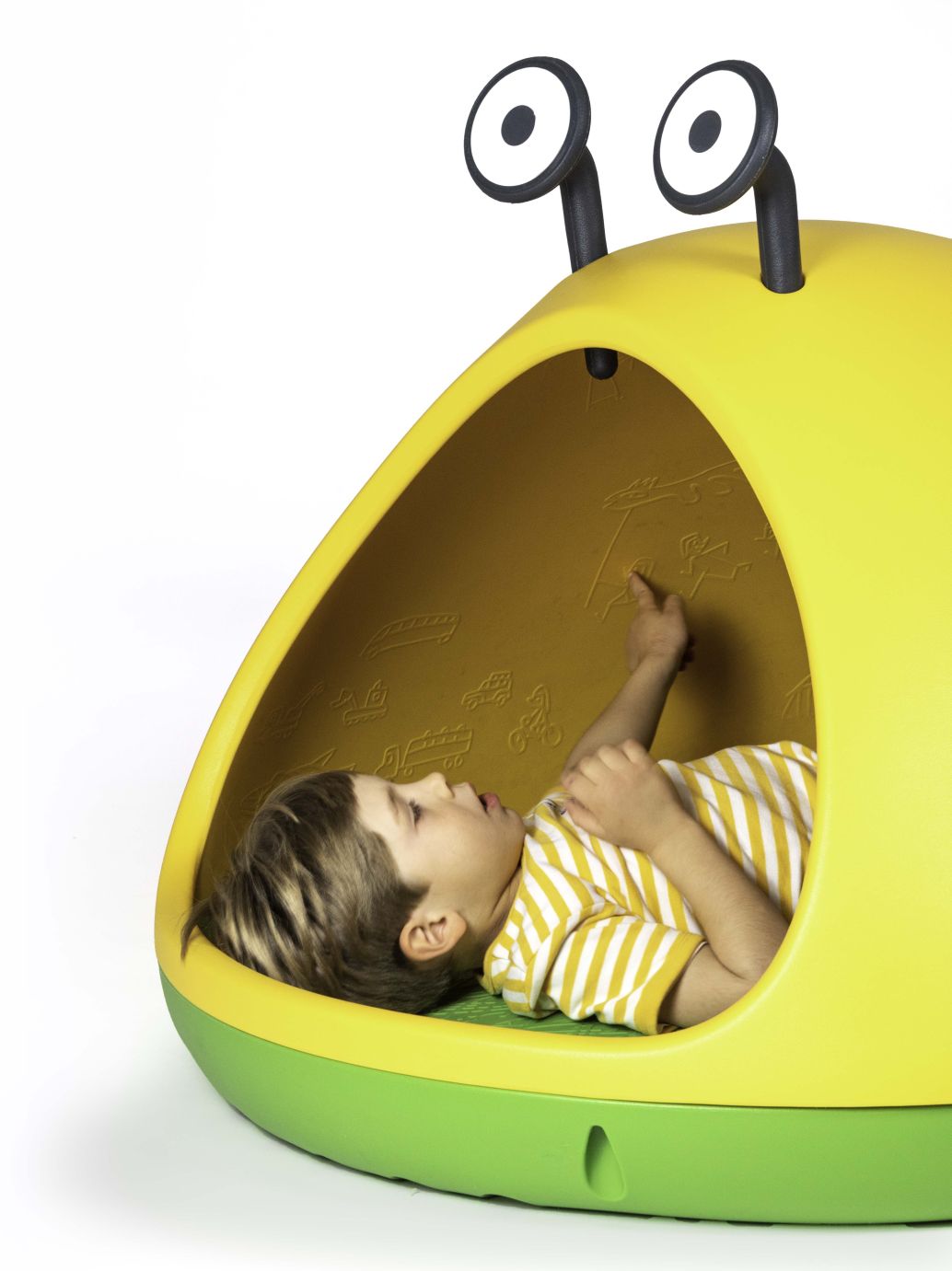 Die runde Nido Höhle besteht aus dem stabilen Kunststoff Polyethylen, der Boden ist grün, die Haube gelb und die Decke im Innern ist mit Graffiti ausgestattet. Nido ist 104 cm breit, 150 cm tief und 83 cm hoch.