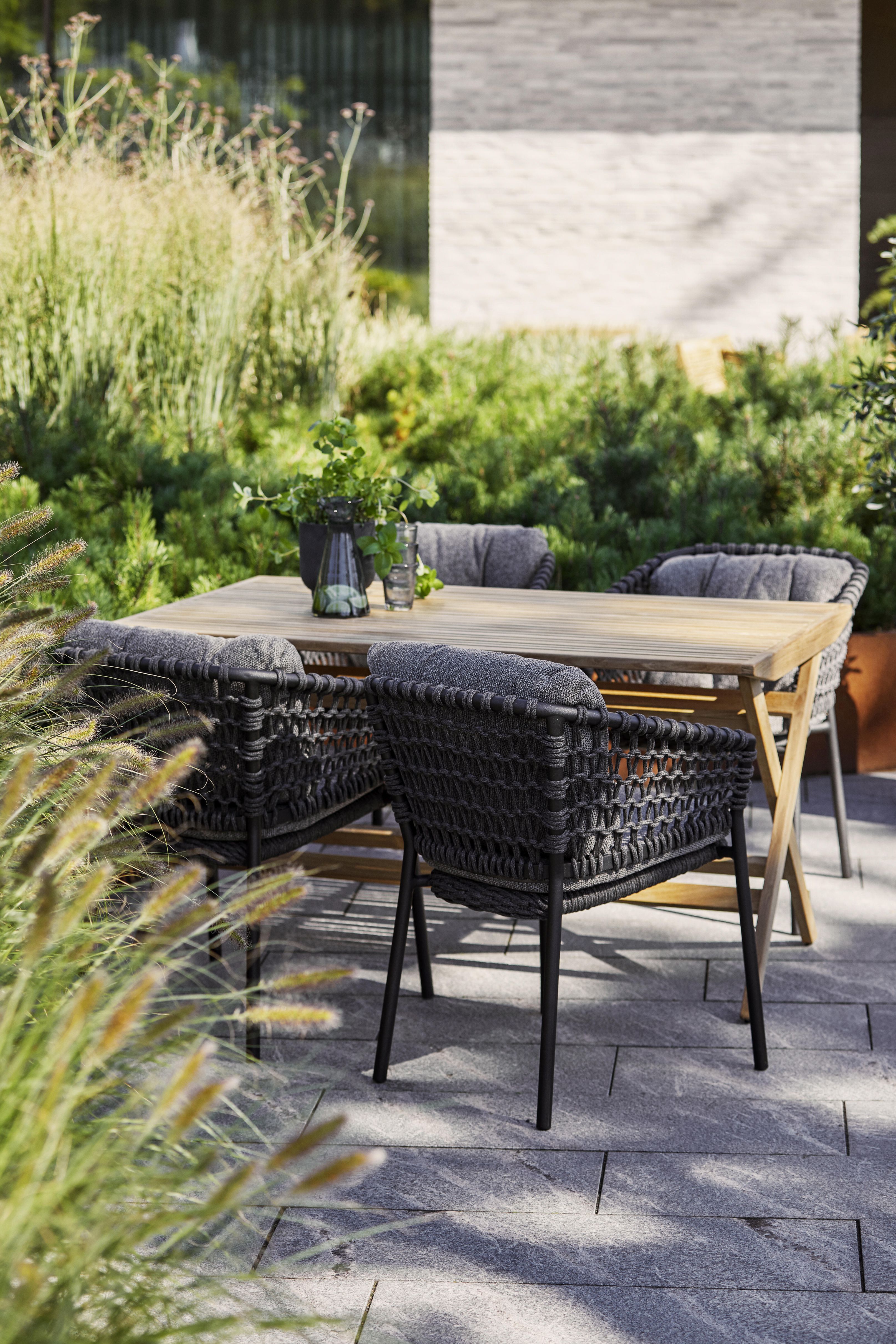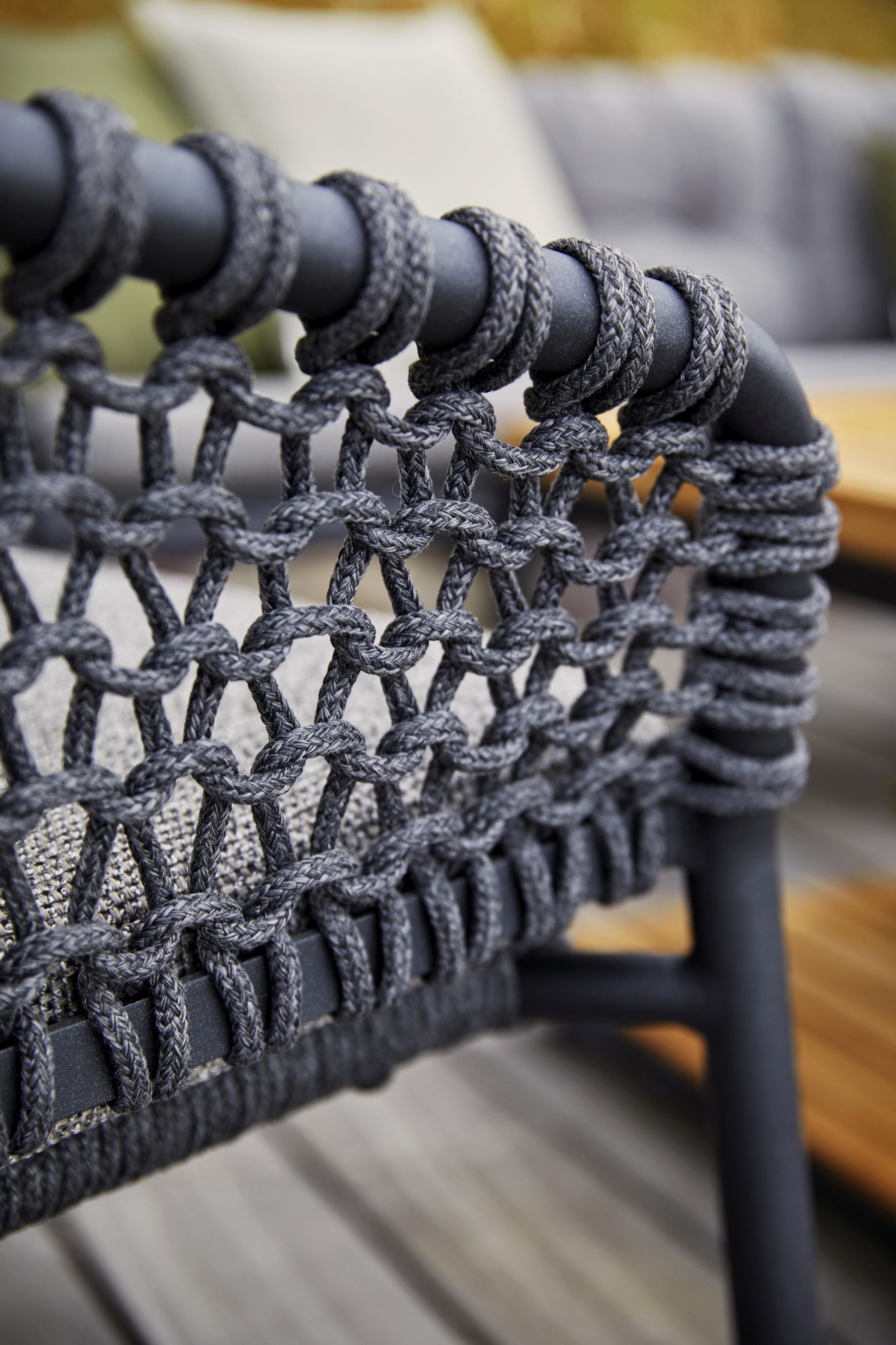 Im Ocean Outdoor Sessel von Cane-Line vereint sich modernes Design mit traditionellem Handwerk. Der elegante Stuhl verfügt über eine besonders angenehme Form, sowohl optisch als auch beim Darinsitzen. Das geflochtene Seil umfasst den Aluminumrahmen und erzeugt einen sehr maritimen Look. So war auch die Wahl des Namens keine Schwierigkeit für das Designteam von Cane-Line.