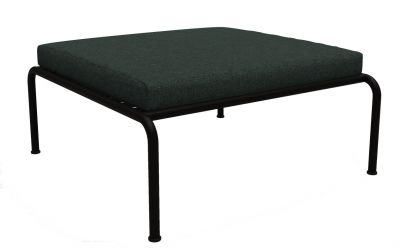 Avon Ottoman: Quadratischer Outdoor Hocker mit dunkelgrünem Kissen und schwarzem Metallgestell.