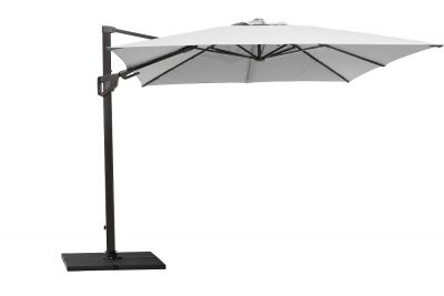 Weißer Hyde Luxe Sonnenschirm von Cane-Line mit Fuß, einseitig befestigt, für Garten und Terrasse.