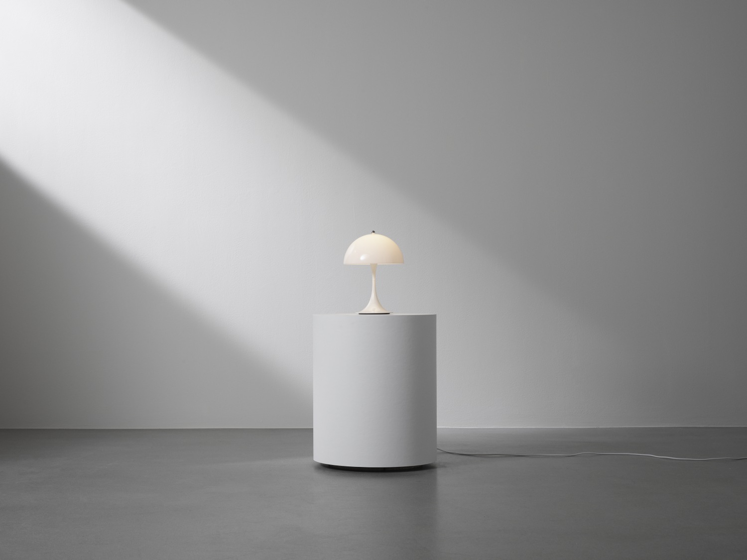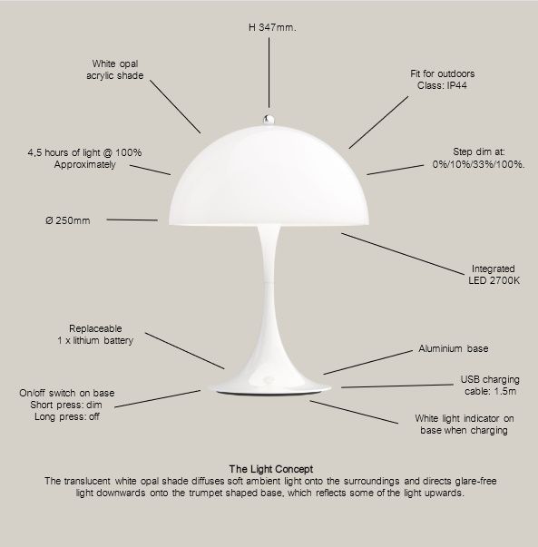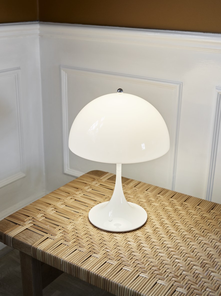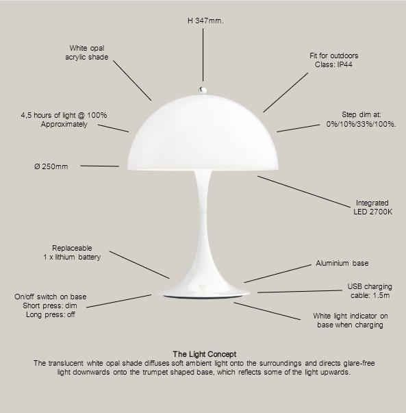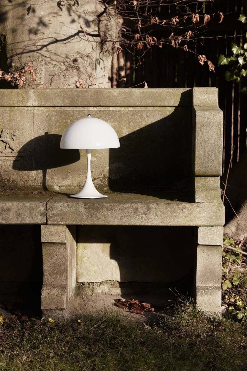 Wie auch die ursprüngliche Metallleuchte strahlt die Panthella Portable ein nach unten gerichtetes Licht ab, das sich im trompetenförmigen Fuß der Leuchte widerspiegelt. Im Gegensatz zu ihrer älteren Schwester ist das Licht der portablen Version dezenter.