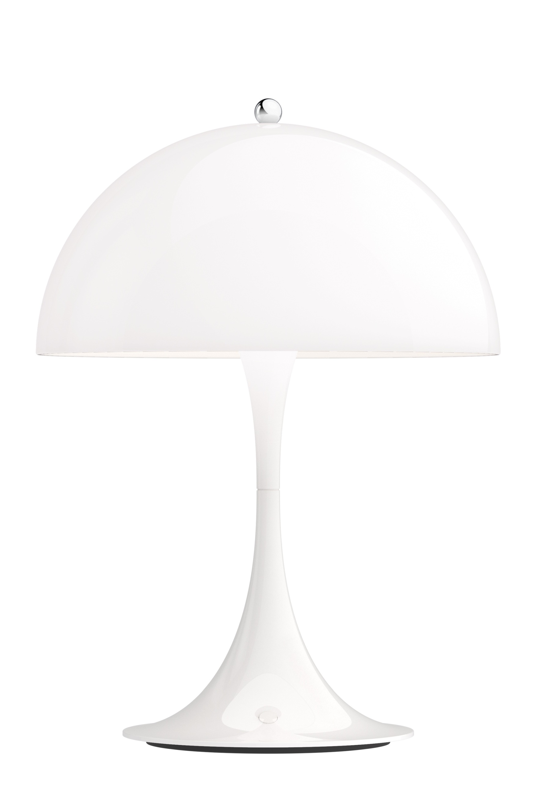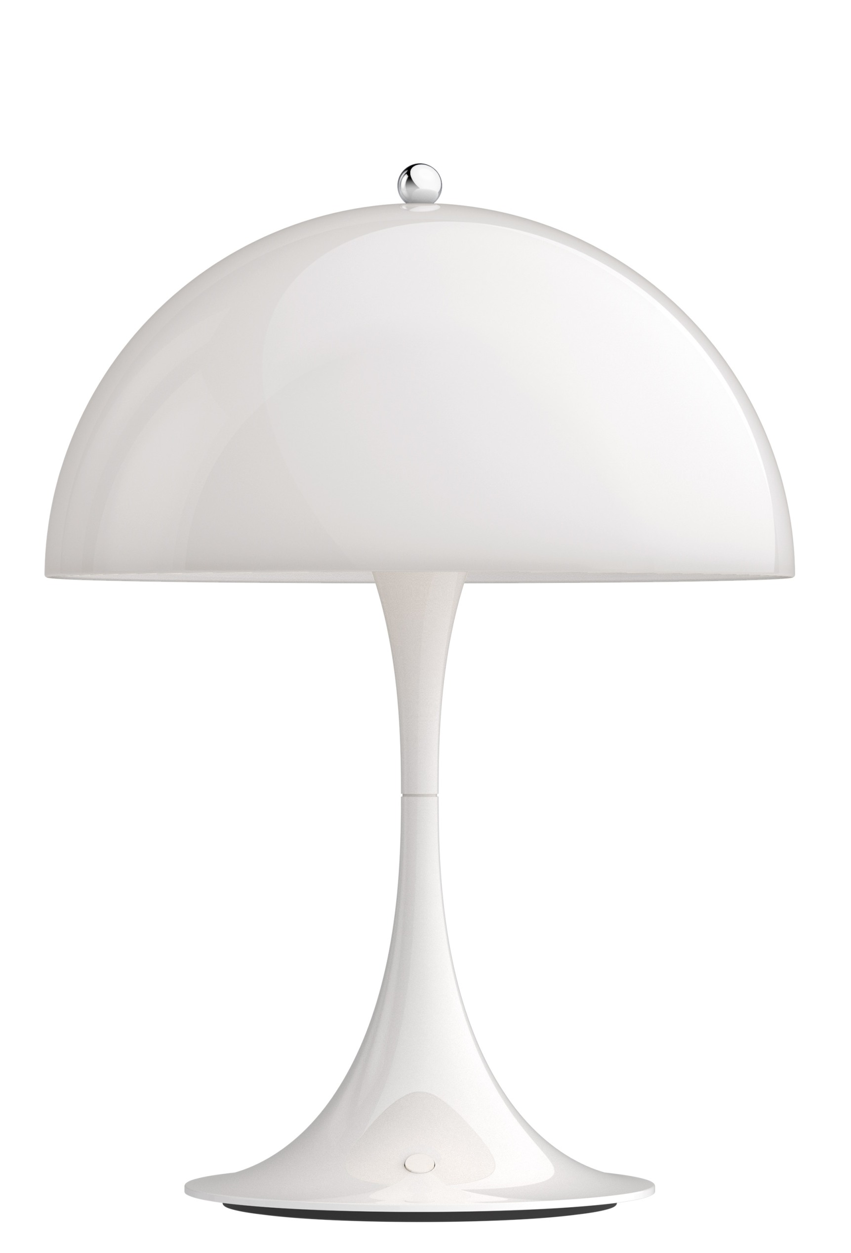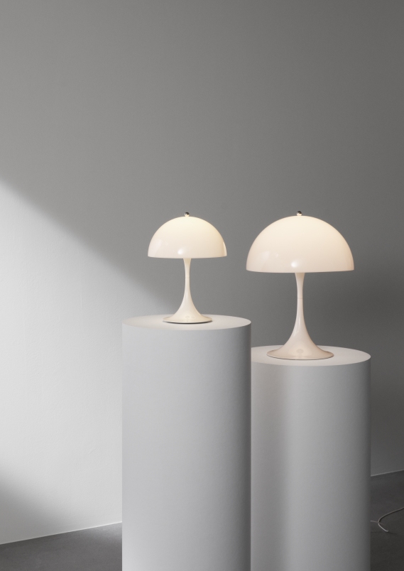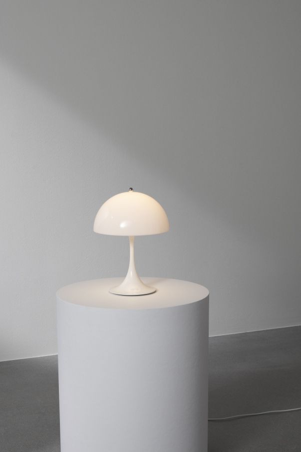 Wie auch die ursprüngliche Metallleuchte strahlt die Panthella Portable ein nach unten gerichtetes Licht ab, das sich im trompetenförmigen Fuß der Leuchte widerspiegelt. Im Gegensatz zu ihrer älteren Schwester ist das Licht der portablen Version dezenter.