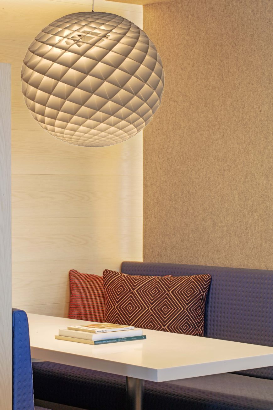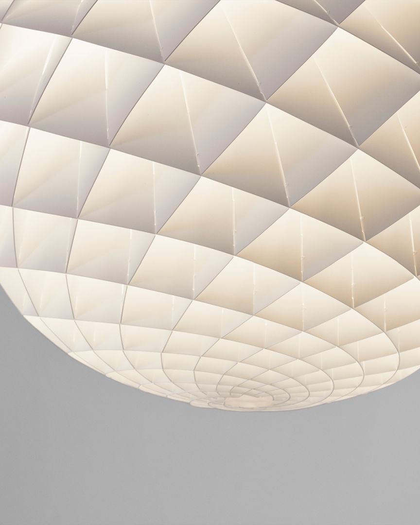 Aus rautenförmigen Zellen zu einer Kugel zusammengesetzt, strahlt die Leuchte ein weiches, diffuses Licht aus, ohne zu blenden. Das Licht ist nicht nur nach unten gerichtet, sondern strahlt dank des 360°-Winkels auch nach oben und erhellt so die Decke. So entsteht ein bemerkenswertes Lichtspiel und eine angenehme Atmosphäre.