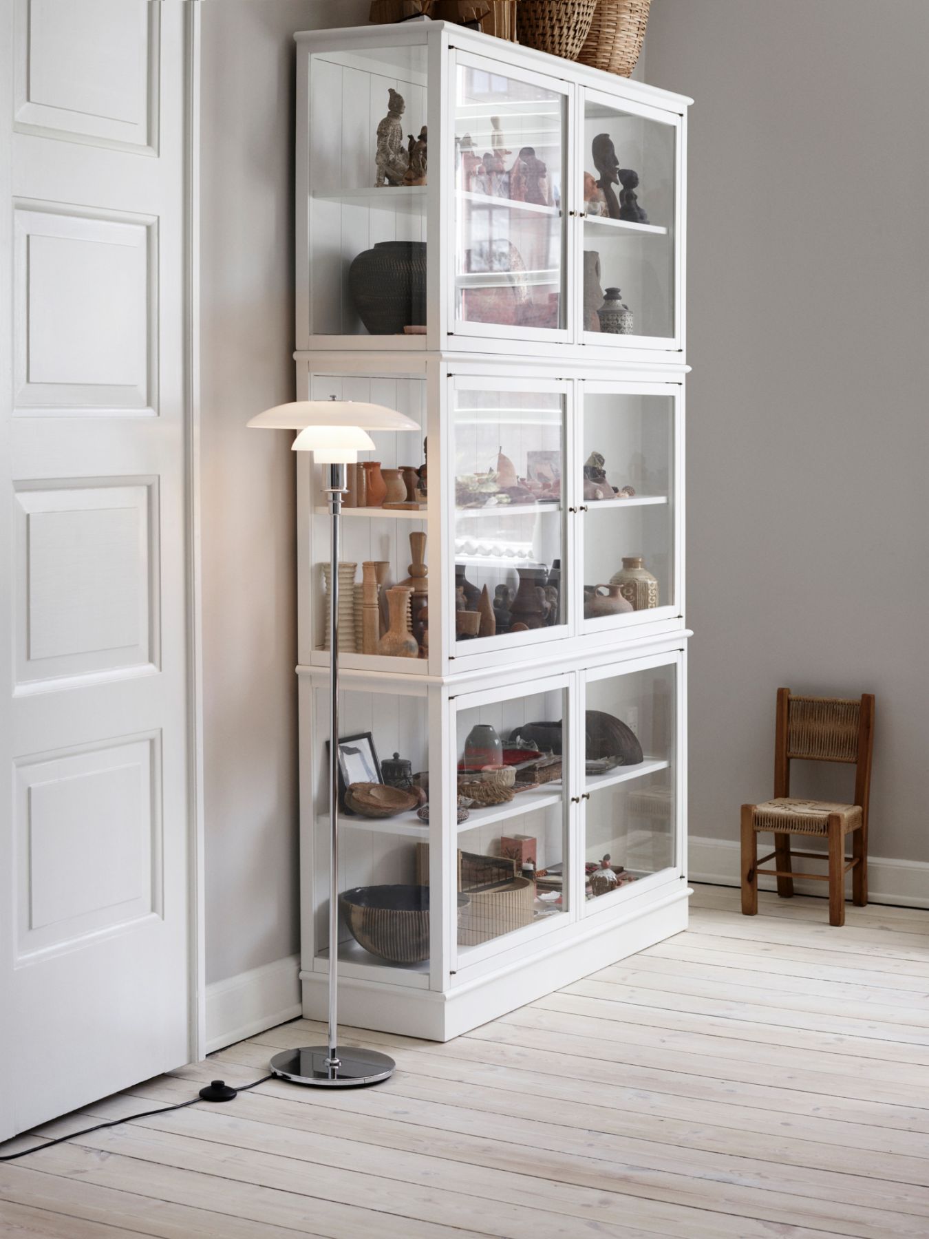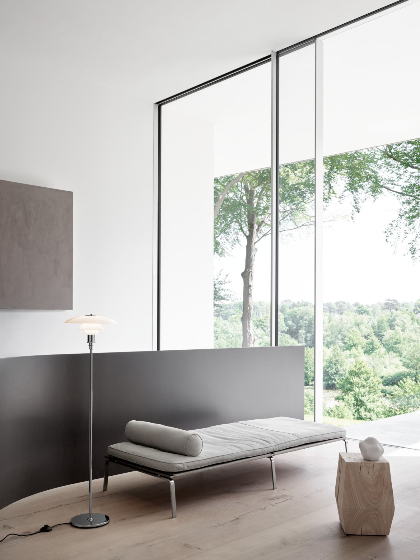 Das Modell PH PH 3 1/2 - 2 1/2 Stehleuchte gehört zur 30 Modelle umfassenden Serie mit dreiteiligem Schirm, von denen drei Außenleuchten sind.