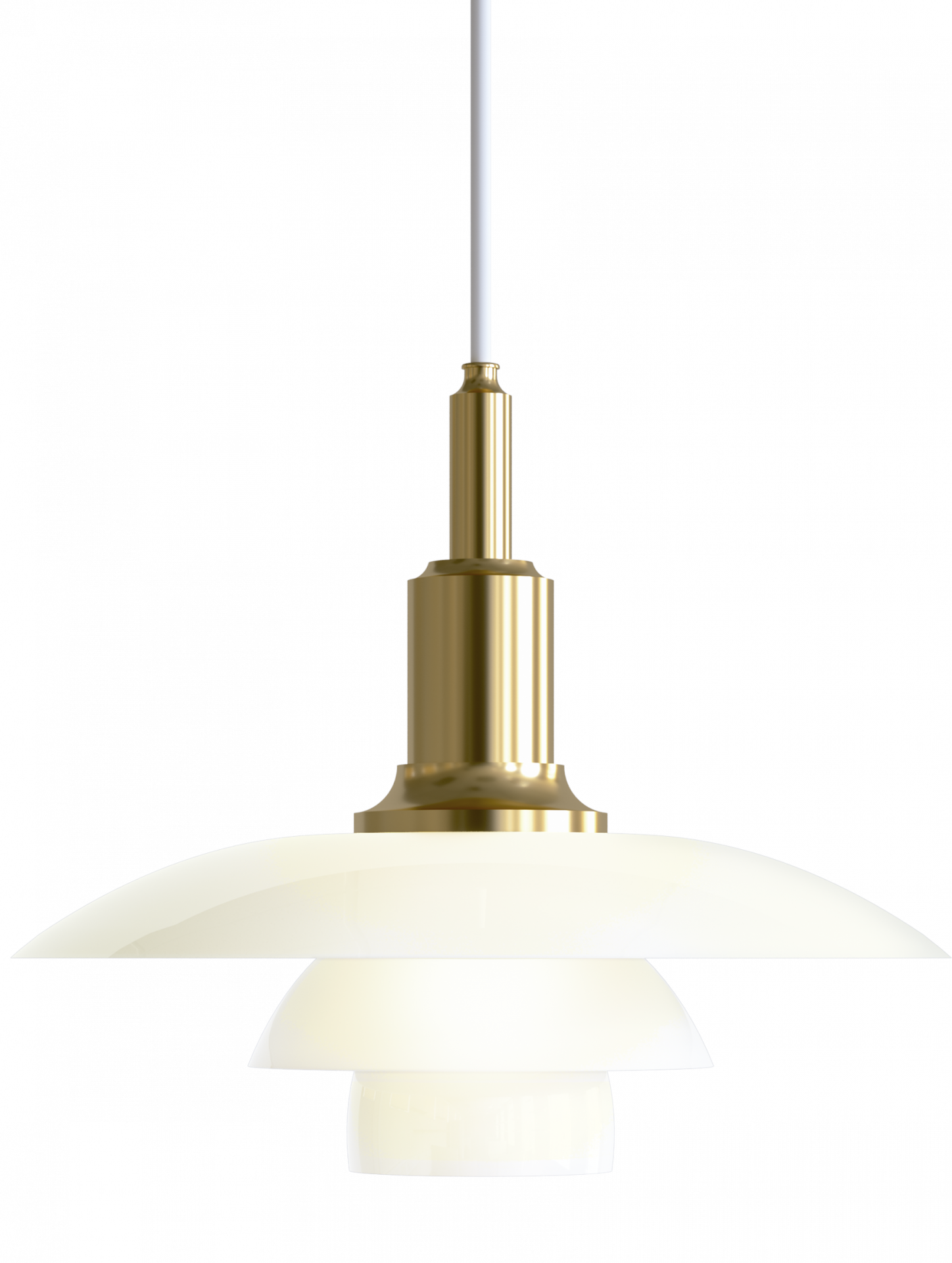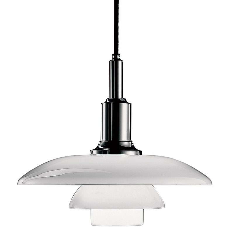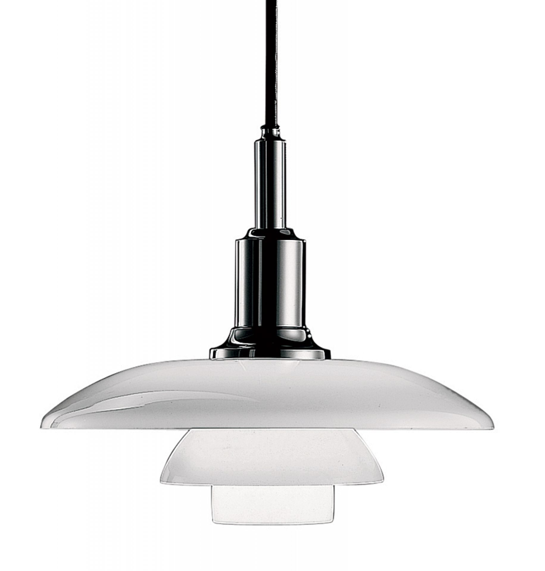 Das Modell PH 3/2 Pendelleuchte gehört zur 30 Modelle umfassenden Serie mit dreiteiligem Schirm, von denen drei Außenleuchten sind.
