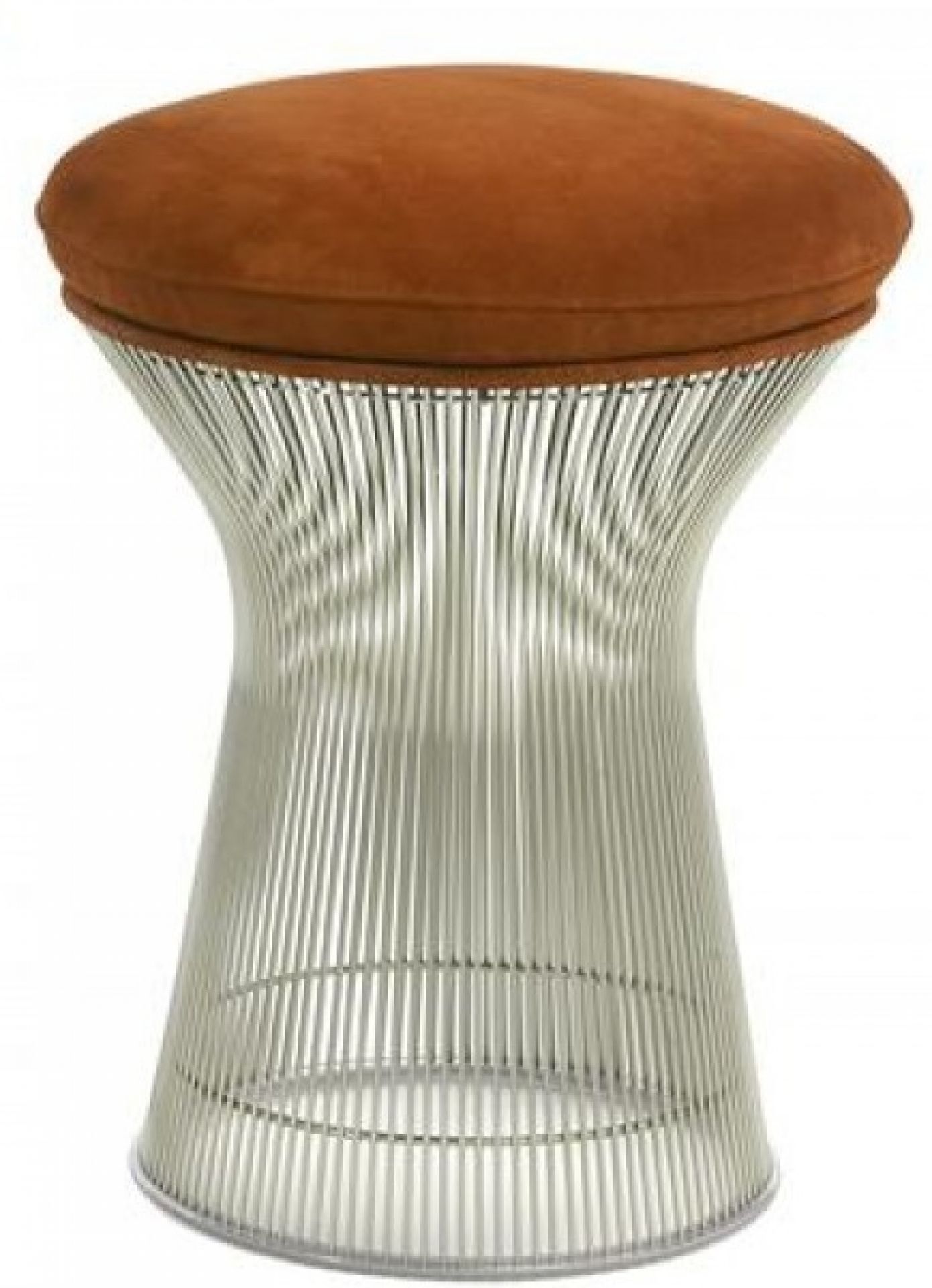 Die Basis des Platner Sitzhockers bildet ein Gestell aus vertikalen Stahldrahtstäben, die mit kreisförmigen horizontalen Stäben und Randstäben verschweißt sind. Bei uns haben Sie hier die Wahl zwischen der silbrigen Nickel- und der dunklen Bronze-Variante. Der Sockel ist mit einem klaren Kunststoffring versehen, der eine glatte Bodenfläche bildet.
