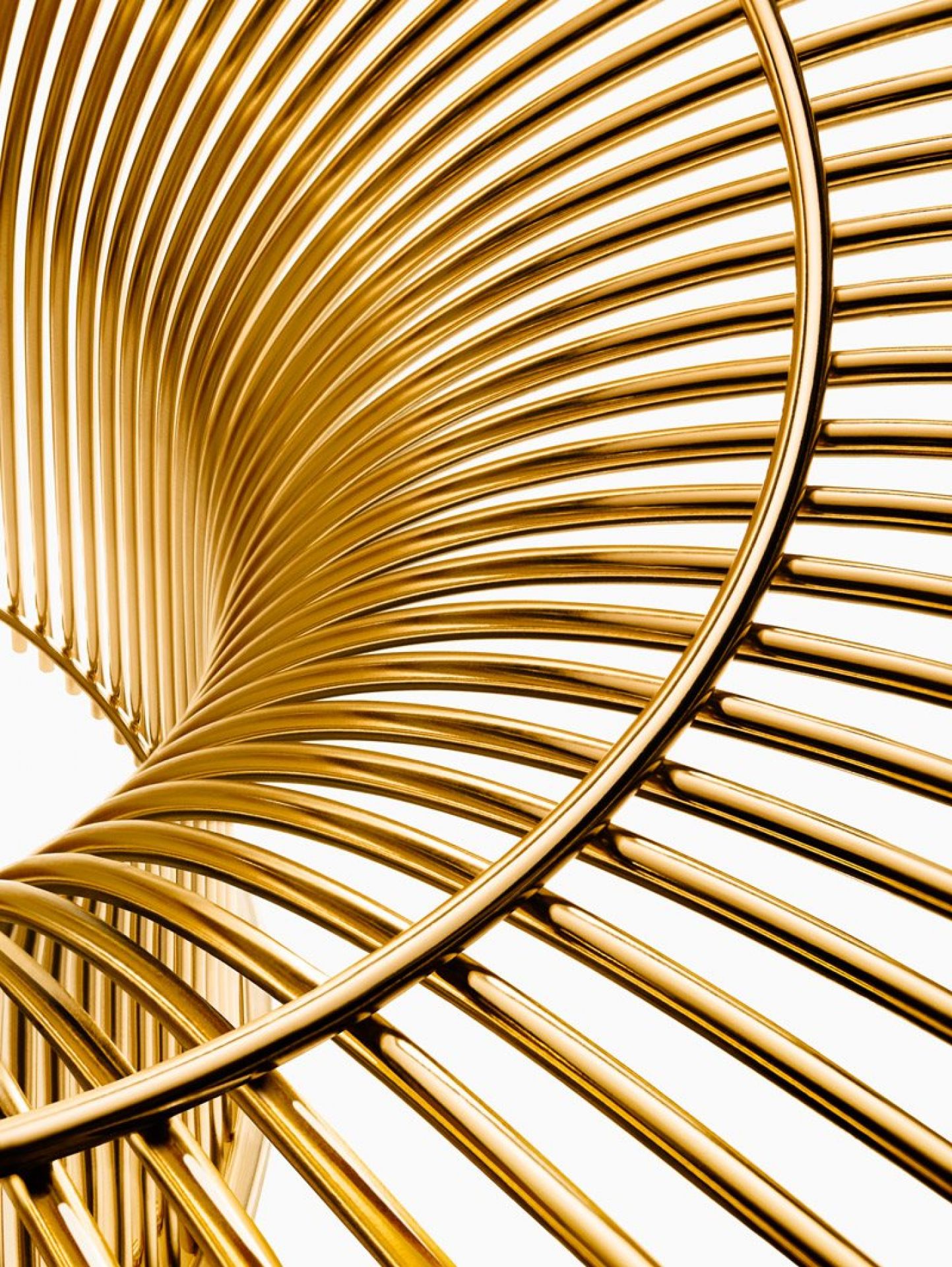 Das Gestell besteht aus vertikalen Stahldrahtstäben, die mit kreisförmigen horizontalen Stäben und Randstäben verschweißt sind. Hier haben Sie die Wahl zwischen der silbrigen Nickel-, der dunklen Bronze- sowie der 18 Karat vergoldeten Variante.