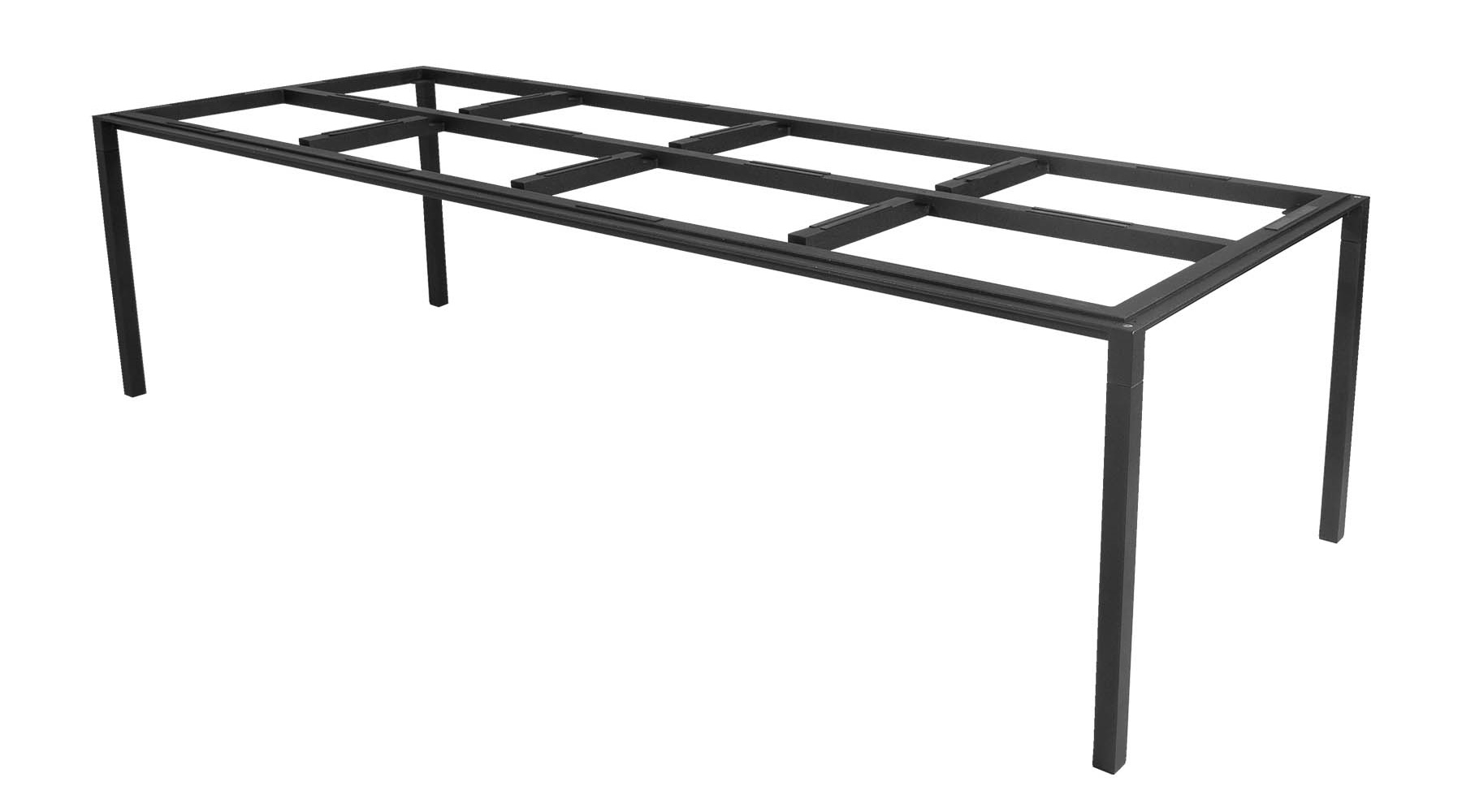 Der Tisch ist aus Keramik und Aluminium gefertigt. Er ist 280 cm breit, 100 cm tief und 74 cm hoch.