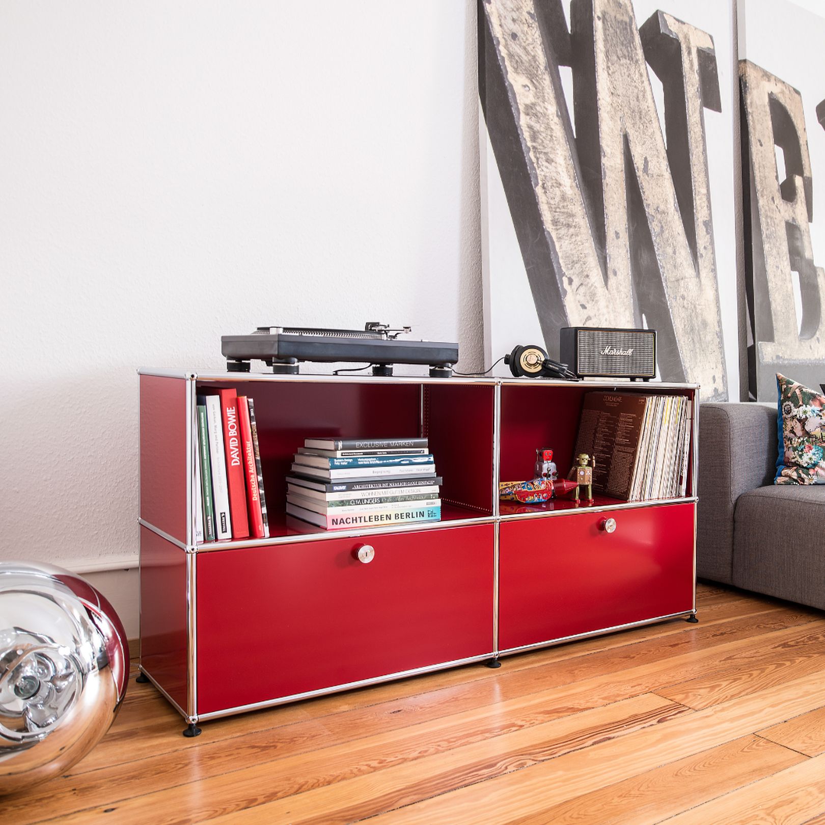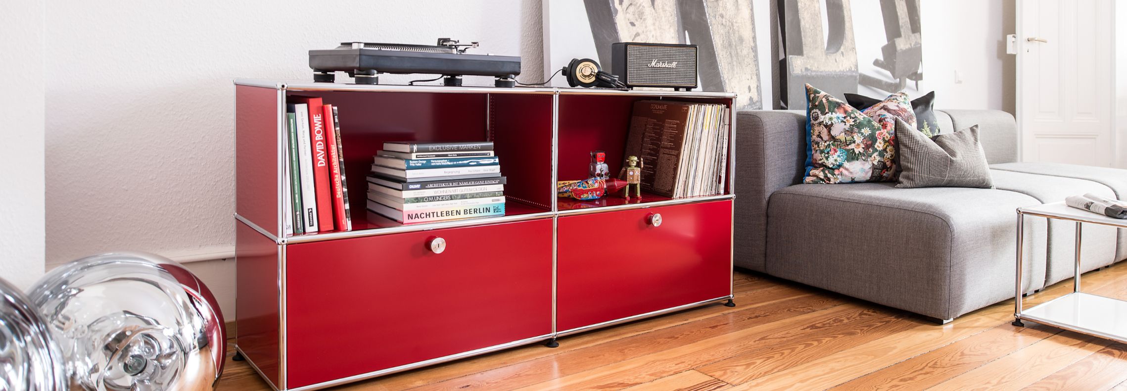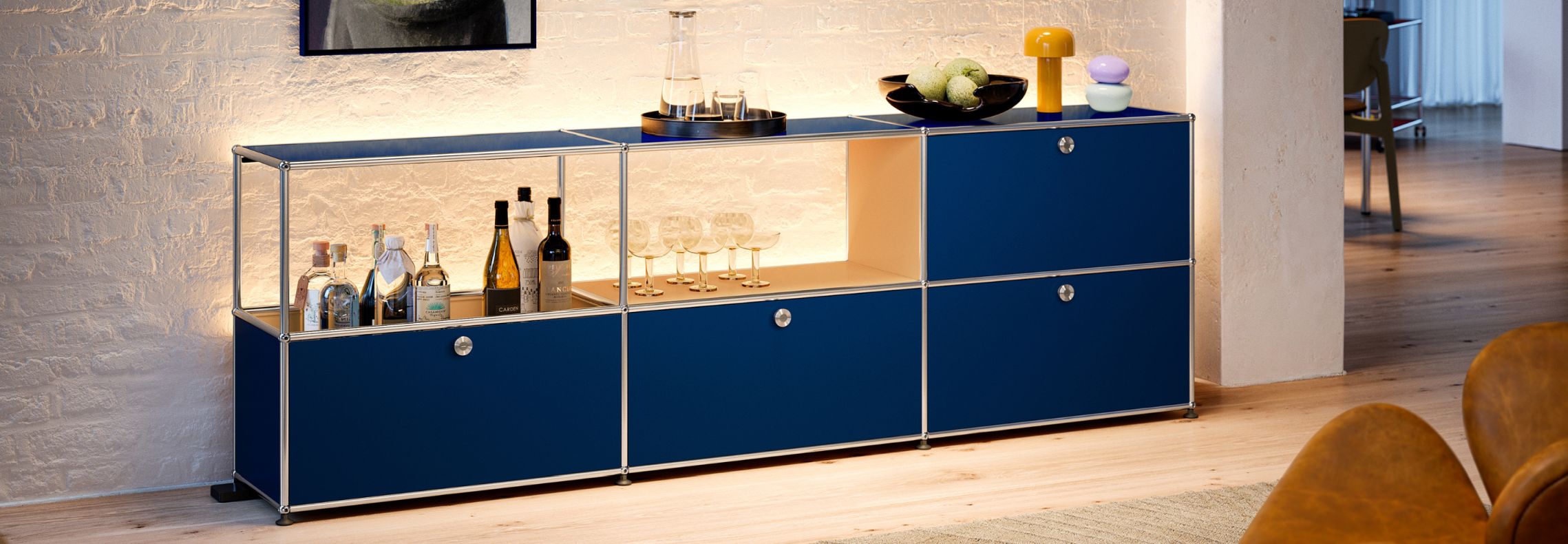Das USM-Sideboard kommt in den unterschiedlichsten Variationen daher. Egal ob eine offene Lösung, Glastüren oder andere große Klapptüren - das Sideboard bewahrt Ihre Lieblingsstücke, ist aber auch für den Büroalltag geeignet um Dokumente, Ordner oder anderes Büromaterial zu verstauen.
