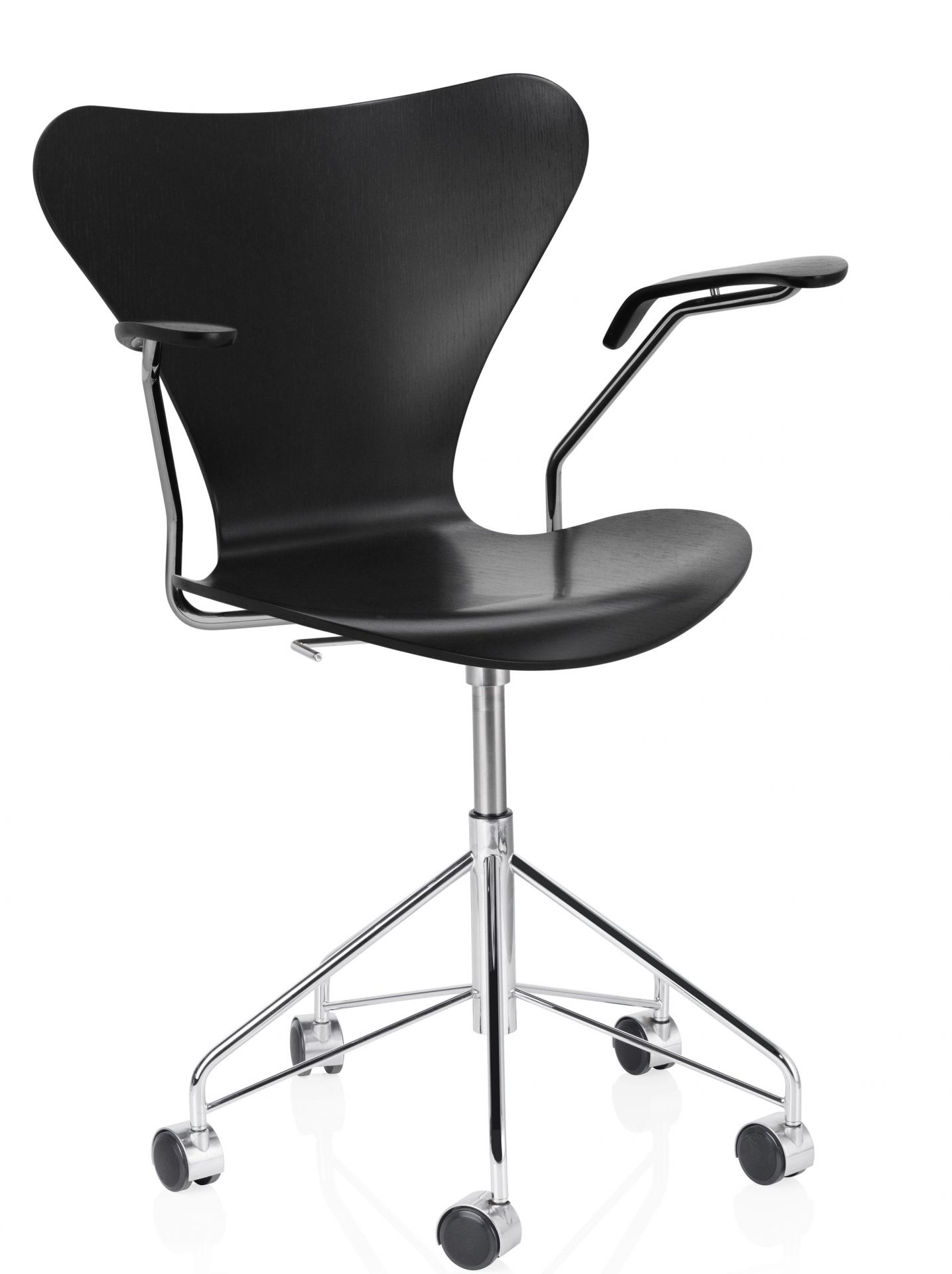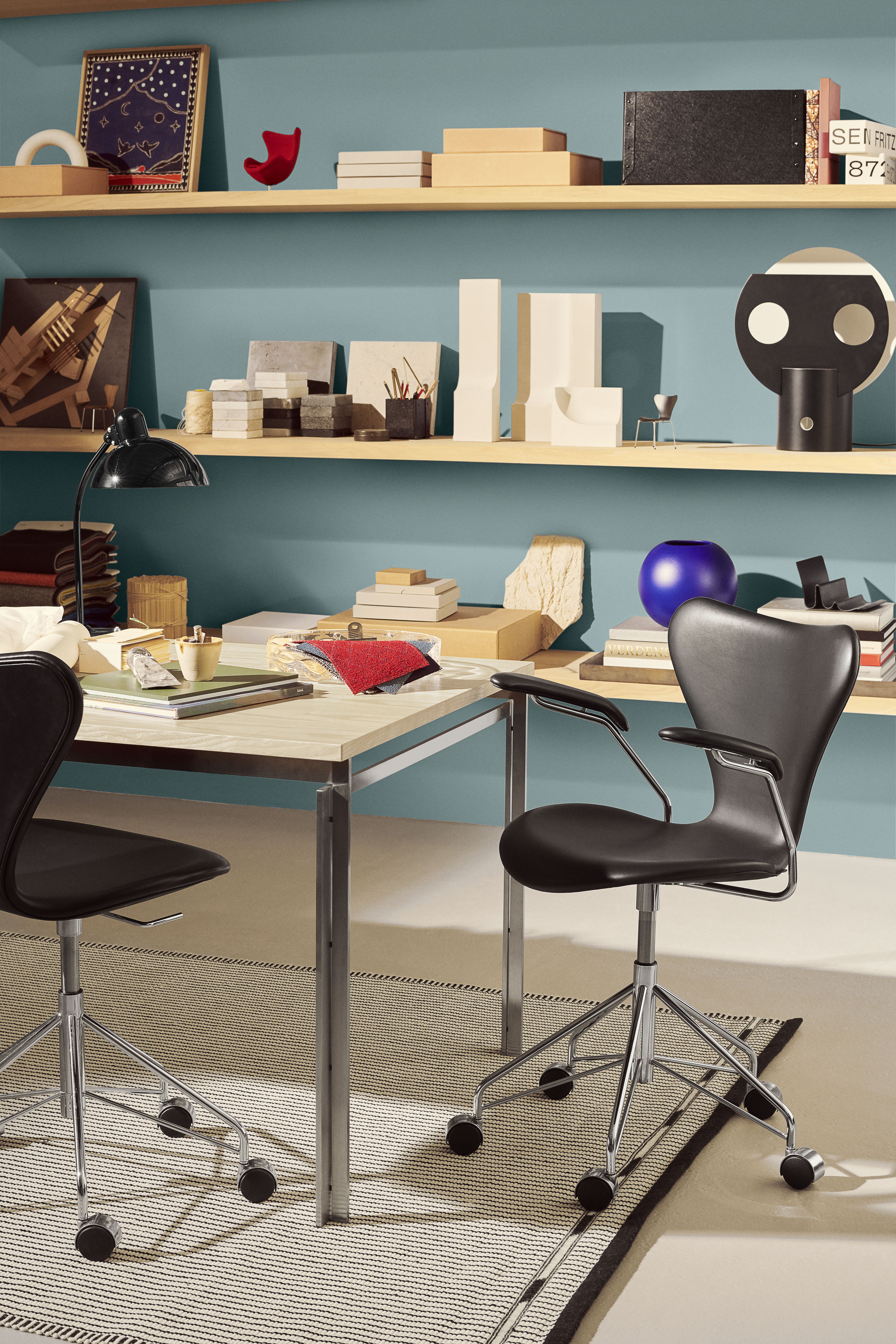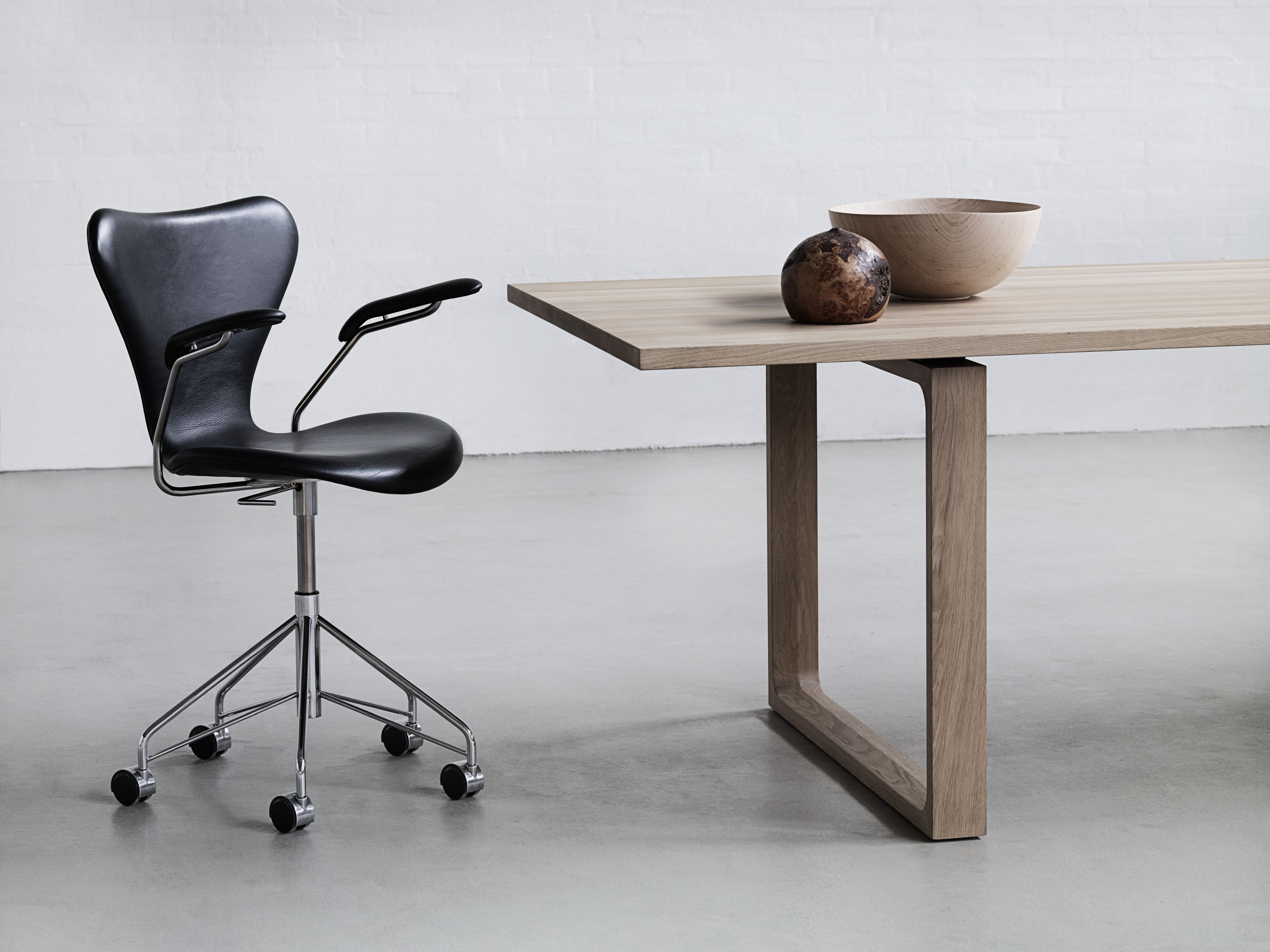 Arne Jacobsen entwarf die Serie 7 zu der auch der 3107 Vierbeinstuhl gehört. Fritz Hansen hat neben dem bekannten Vierbeiner auch den Drehstuhl 3217 in seinem Sortiment.