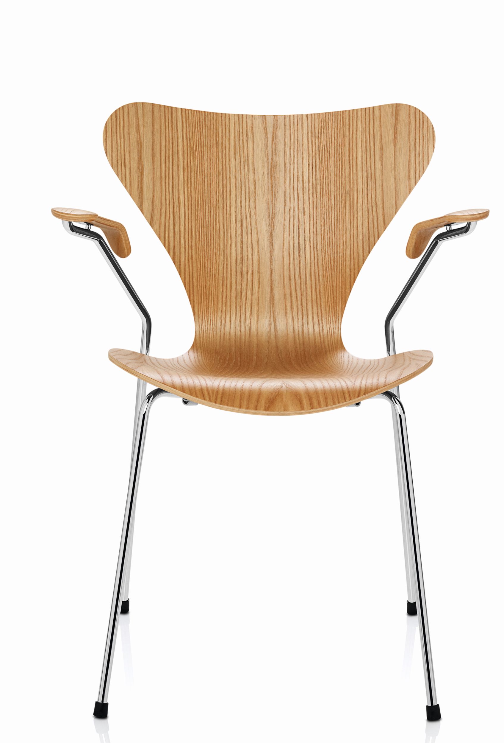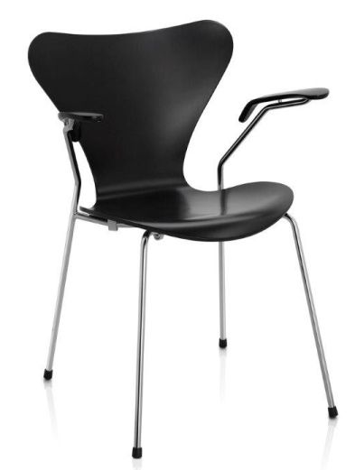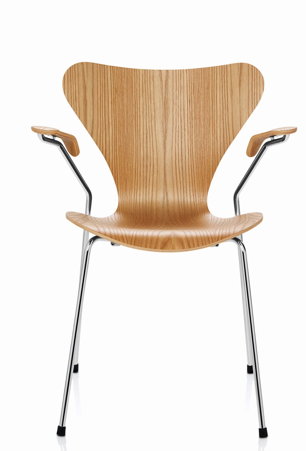 Der vierbeinige Stuhl mit Armlehnen wird mit der Technik der Schichtverleimung produziert. Diese Technik wurde in den 20er und 30er Jahren von Soeren C. Hansen, dem Enkelsohn des Firmengründer Fritz Hansen, perfektioniert. Der Designer Arne Jacobsen schöpfte die Möglichkeiten der Schichtverleimung bei der Schaffung diesen Klassikers voll aus.