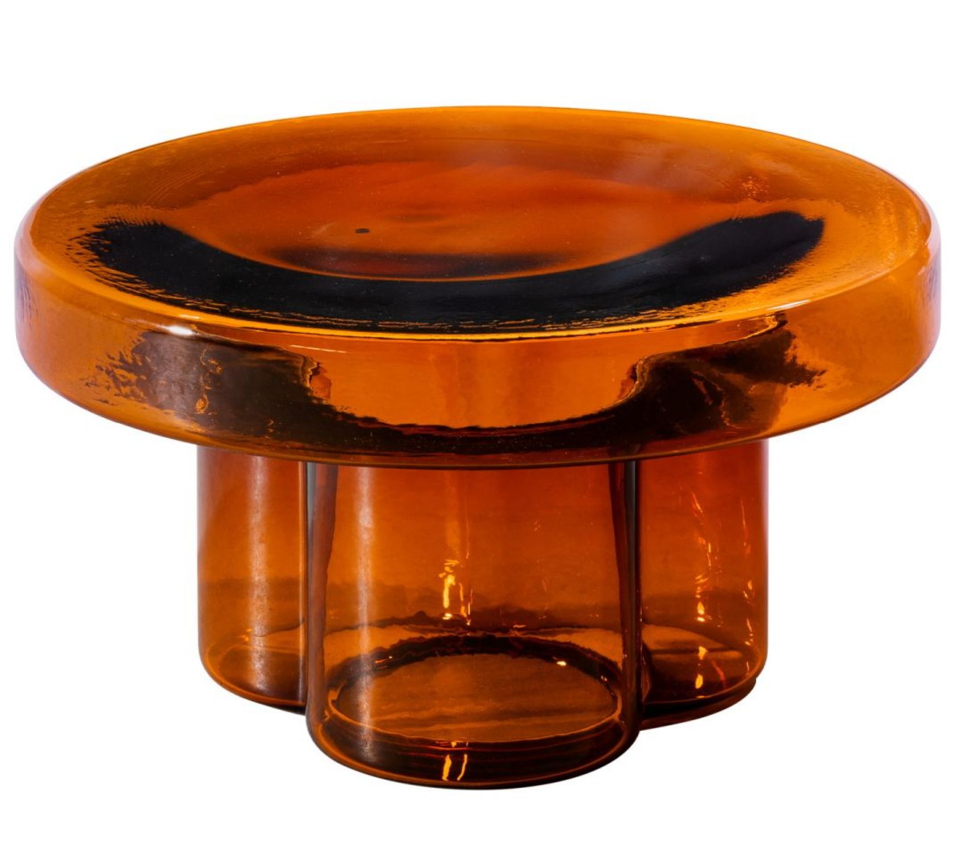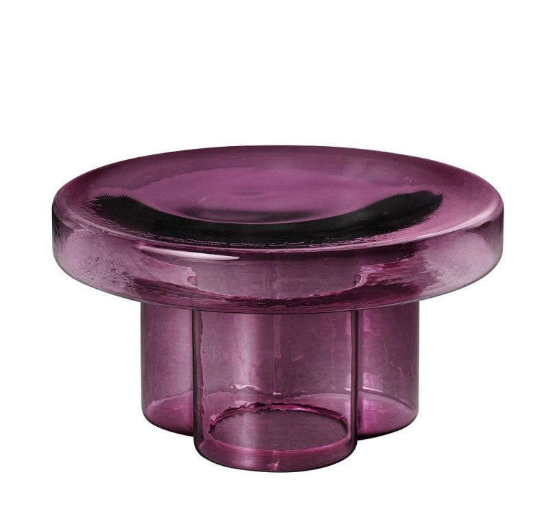 Der Tisch besteht aus Glas und ist in mehreren Farbvarianten erhältlich. Er misst 55 cm im Durchmesser der Platte, 35 cm im Durchmesser des Standfußes und 30 cm in der Höhe. Die Tischplatte ist 8 cm stark.