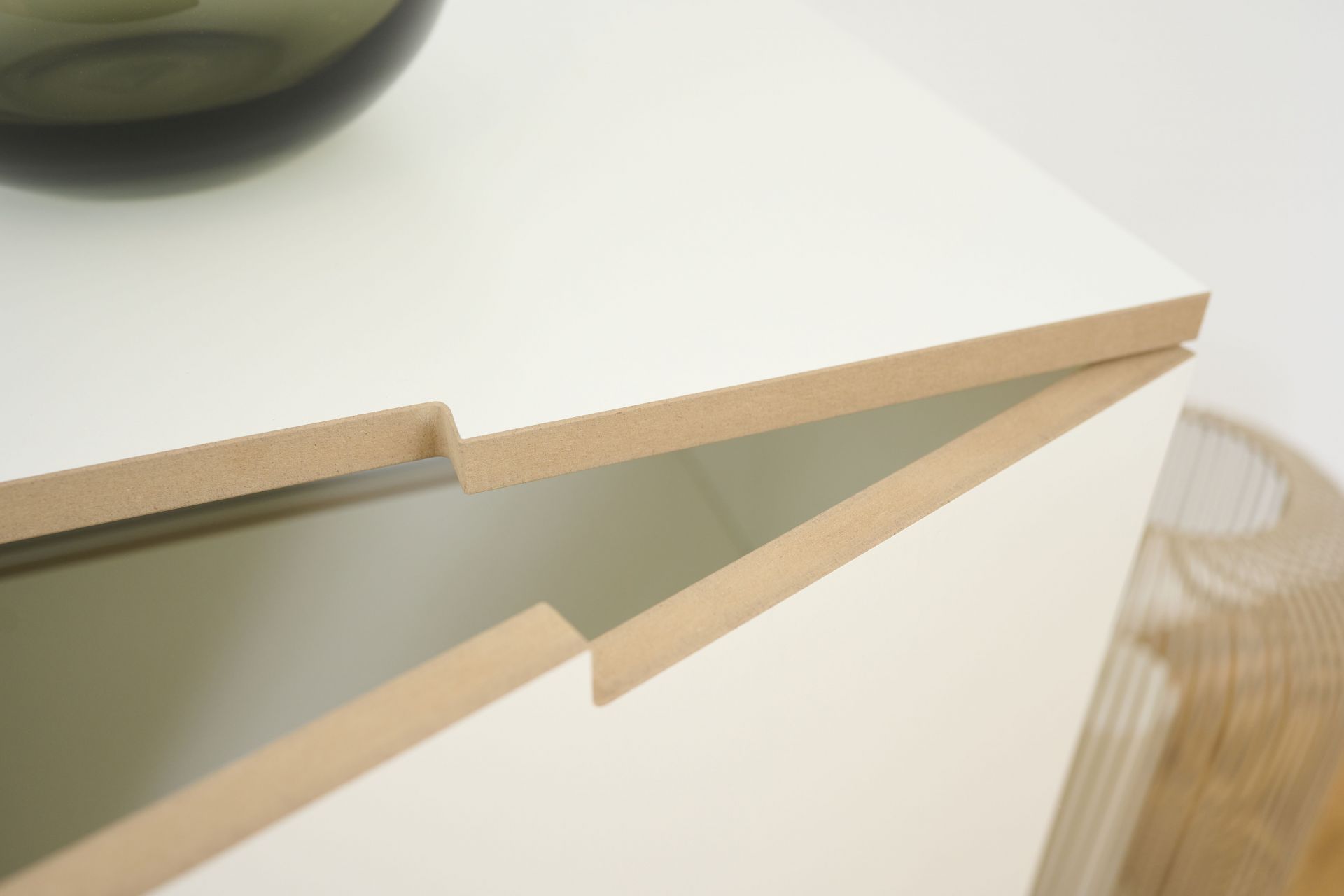 Das Sideboard besteht aus beschichteten MDF Platten. Als Flat-Pack-Möbel und bauteileoptimiert kann der Korpus werkzeuglos von einer Person aufgebaut und wieder zerlegt werden. Einzig für die Befestigung der Scharniere ist ein Werkzeugeinsatz nötig.