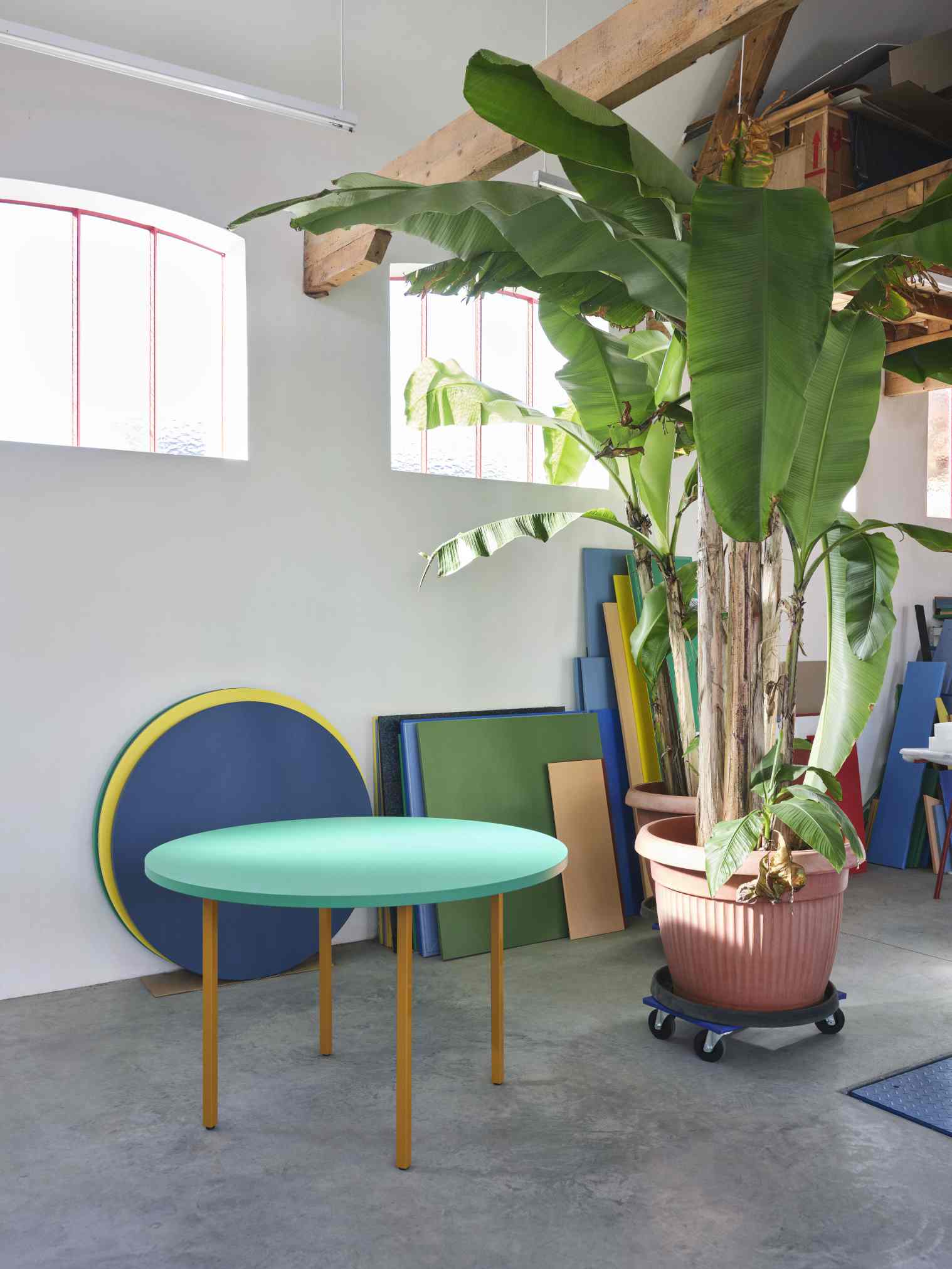 Die runde Tischplatte mit einer Dicke von 30 mm sitzt auf einem quadratischen Gestell und besteht aus Valchromat. Hierbei handelt es sich um einen robusten, organisch gefärbten, FSC™-zertifizierten Holzfaserwerkstoff, der mit einem Hochglanz-Lack auf Wasserbasis versehen ist. Dadurch entsteht eine sanfte, wasserfeste Oberfläche. Bei der Lackierung haben Sie die Wahl zwischen Grau, Blau, Rot und Mintgrün.