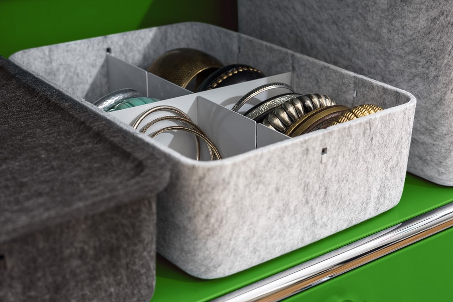Dank dazu bestellbarer Unterteilungen lässt sich der Inhalt der Boxen noch besser strukturieren. Aufbewahren können Sie darin sämtliche Alltagsgegenstände: Von Schreibutensilien über Textilien bis hin zu Spielsachen.
