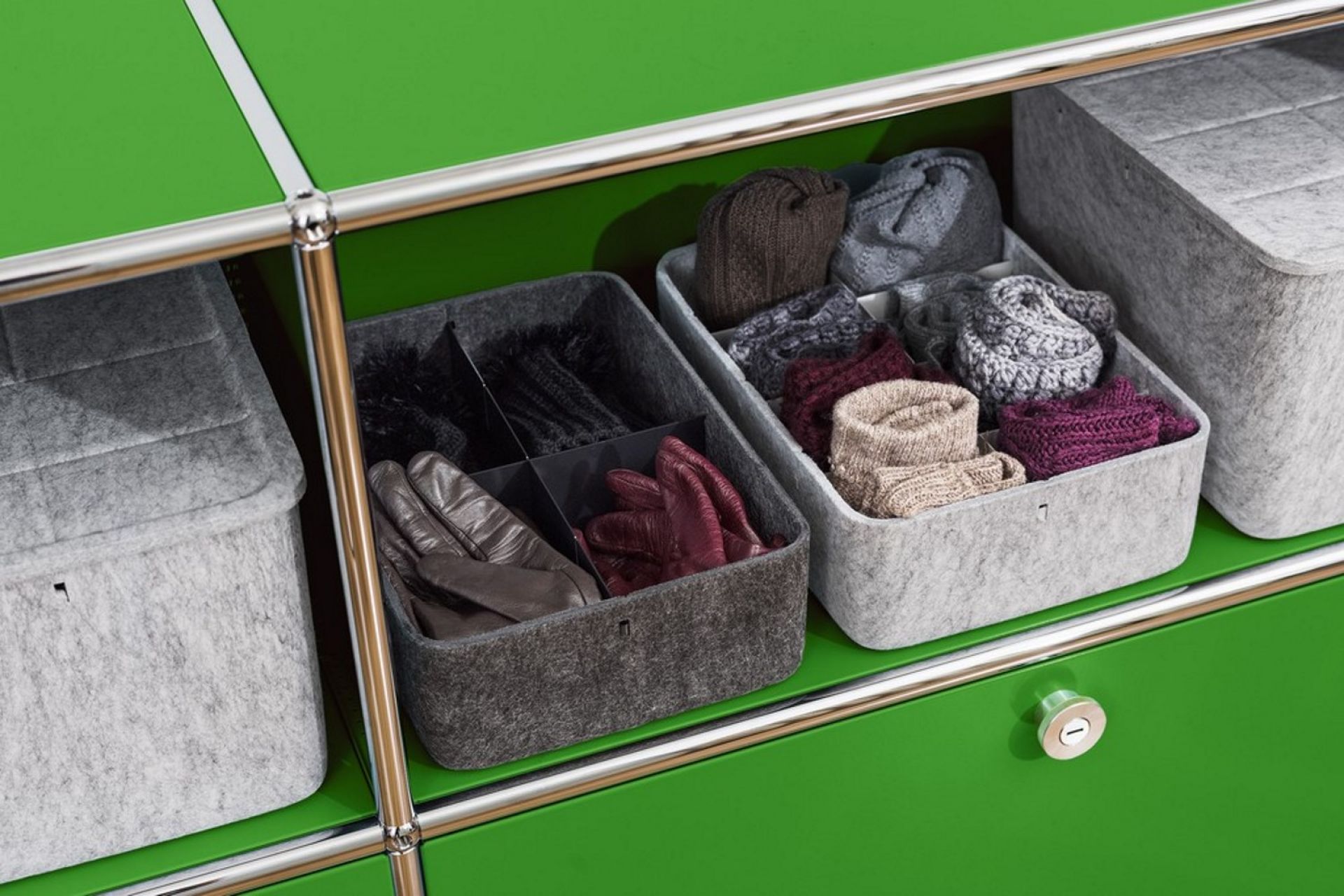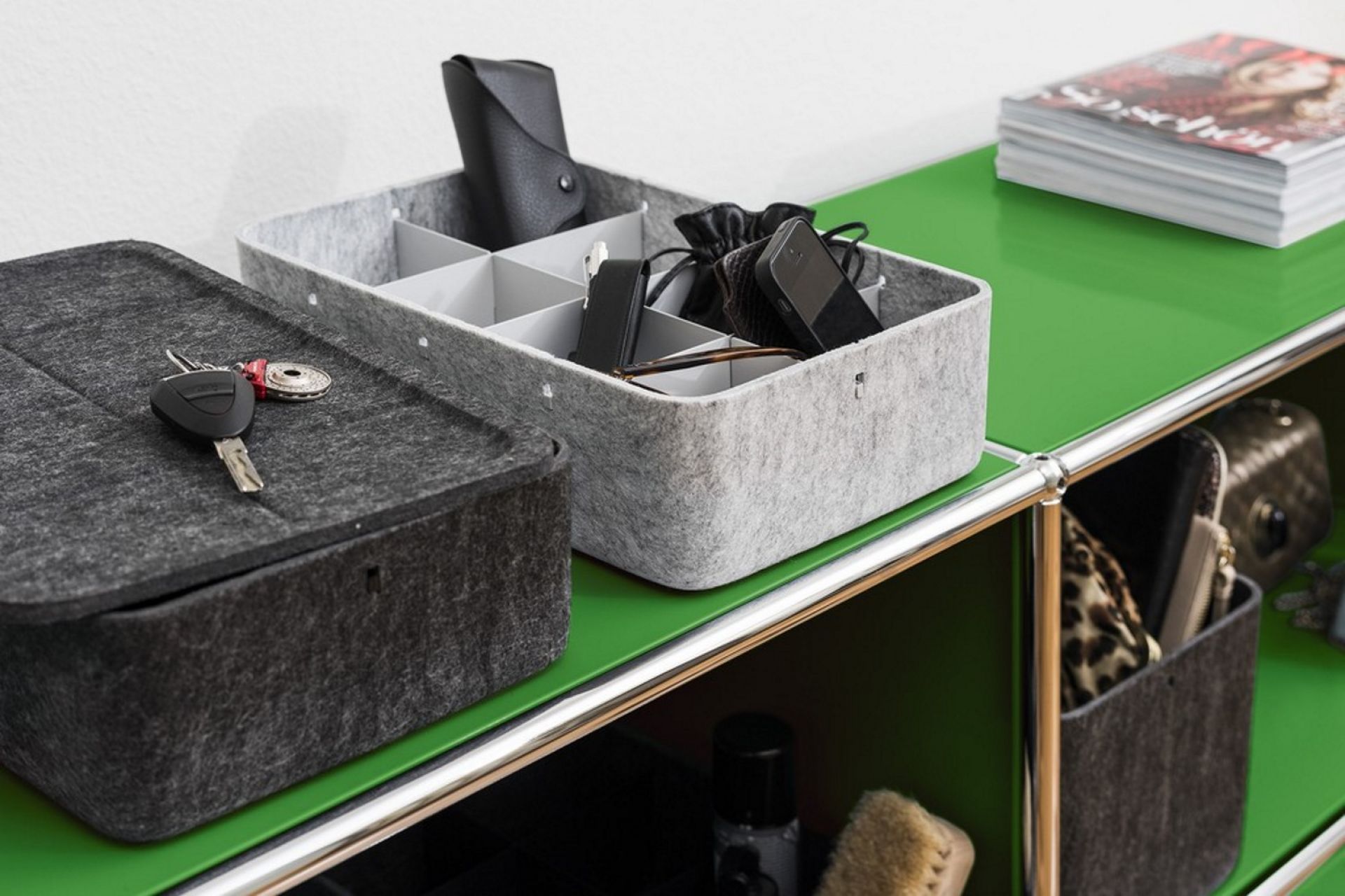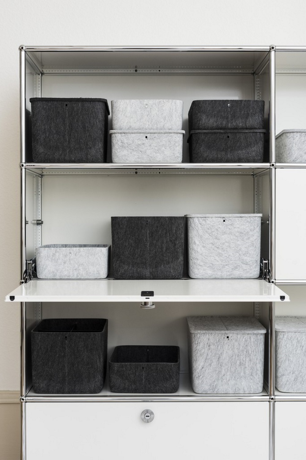 Neu für USM Haller Möbel: Die tiefen Inos Boxen schaffen Ordnung innerhalb der offenen Fächer Ihrer USM Haller Stahlrohrklassiker.