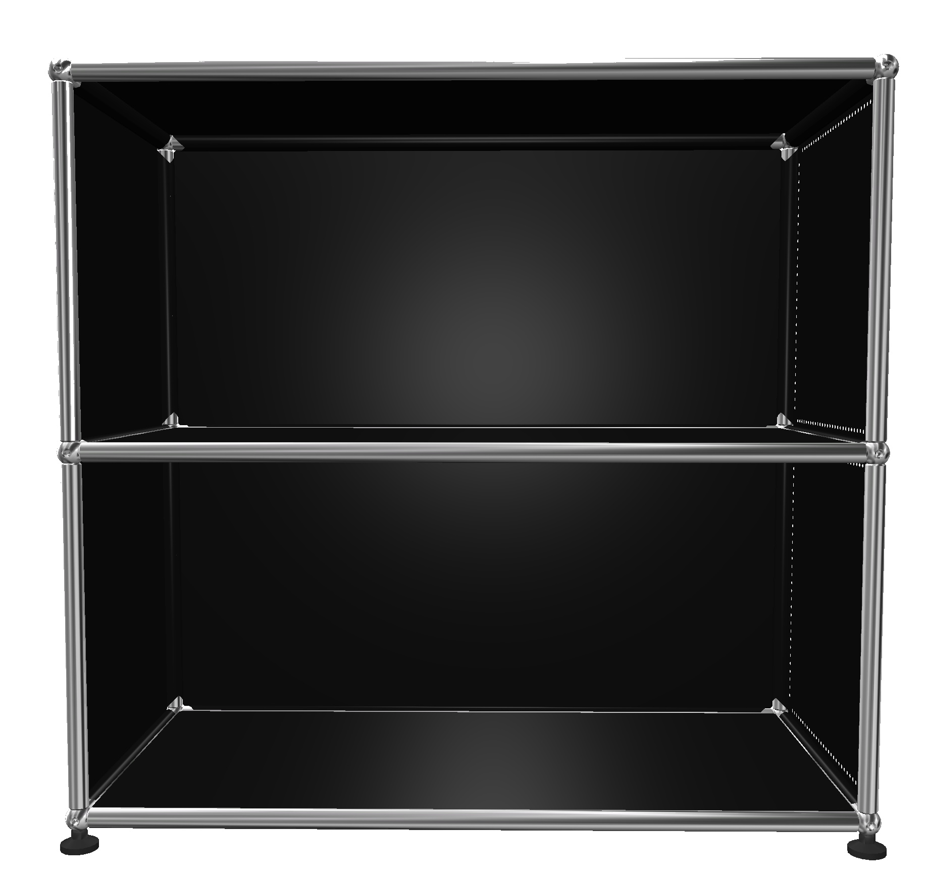 Die Möbel von USM Haller bestehen aus pulverbeschichtetem und verchromtem Metall. Das Regal verfügt über zwei Fächer. Es ist 75 cm breit, 35 cm tief und 75 cm hoch.