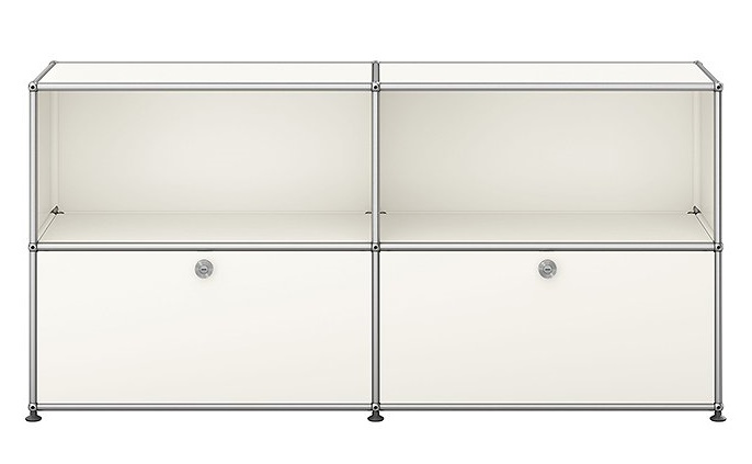 Dieses USM Sideboard ist sowohl mit Seitenwänden als auch mit einer Rückwand versehen. Somit können Sie es frei stehend, als eine Art Raumteiler, verwenden. Die unteren Fächer sind mit Klapptüren versehen, die sich nach unten öffnen lassen. Das Designsideboard besitzt die folgenden Maße: 152,3 x 37,3 x 74 cm (B/T/H).