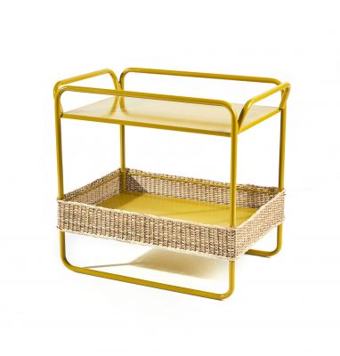 Dichas Beistelltisch: Gelber Nachttisch mit Ablage und geflochtenem Korb, ideal als kleiner Tisch.