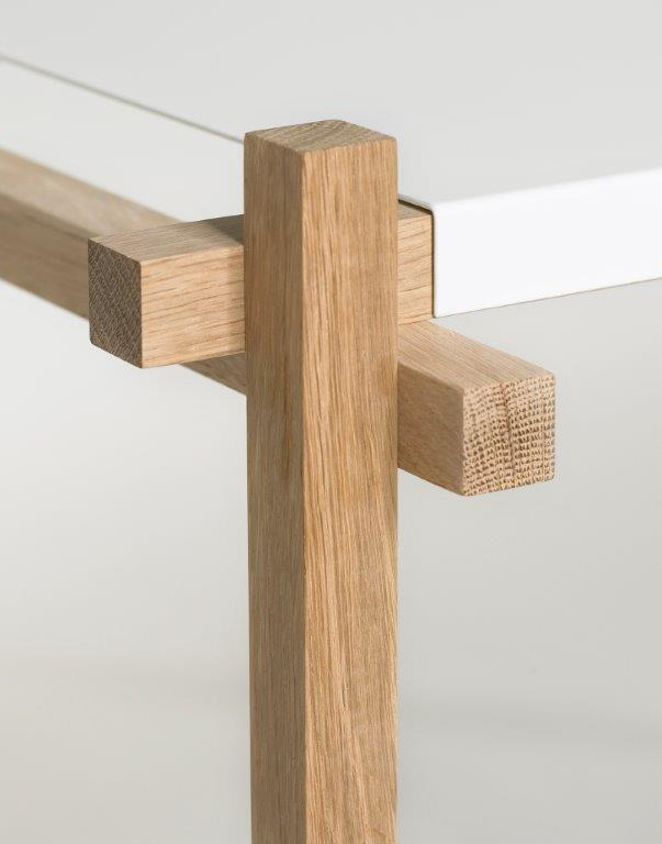 Kein Merkmal der Konstruktion bleibt verborgen; alle Verbindungsstücke liegen offen, und alle Teile kommen aus industrieller Herstellung. Herkömmliche Regal-Systeme zu vereinfachen wie auch zu erneuern war eine maßgebliche Vorgabe in der Entwicklung von "Woody"; also besteht es aus nichts mehr als Eichen-Stäben, geformtem Stahl und Schrauben. Zugleich wurde aber alles getan, um die Gelenke, Nähte und Fugen in ihrer Form und Eignung zu verbessern.