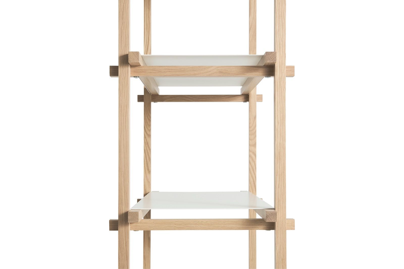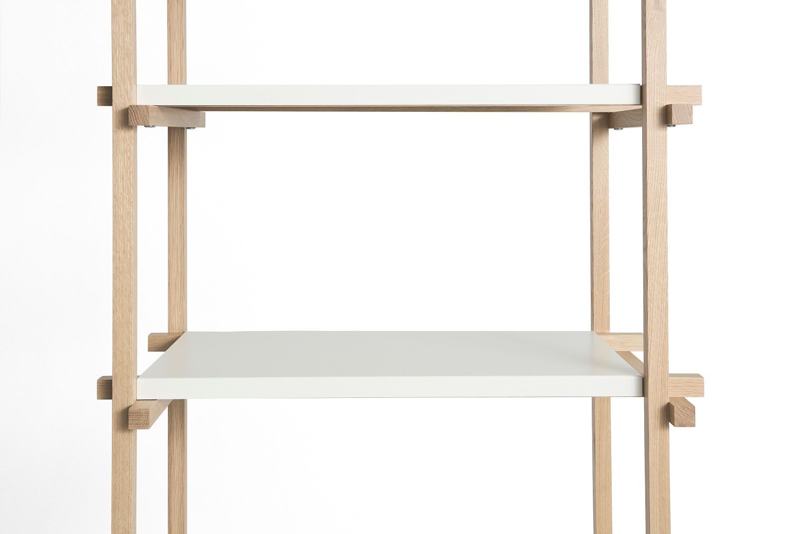Kein Merkmal der Konstruktion bleibt verborgen; alle Verbindungsstücke liegen offen, und alle Teile kommen aus industrieller Herstellung. Herkömmliche Regal-Systeme zu vereinfachen wie auch zu erneuern war eine maßgebliche Vorgabe in der Entwicklung von "Woody"; also besteht es aus nichts mehr als Eichen-Stäben, geformtem Stahl und Schrauben. Zugleich wurde aber alles getan, um die Gelenke, Nähte und Fugen in ihrer Form und Eignung zu verbessern.