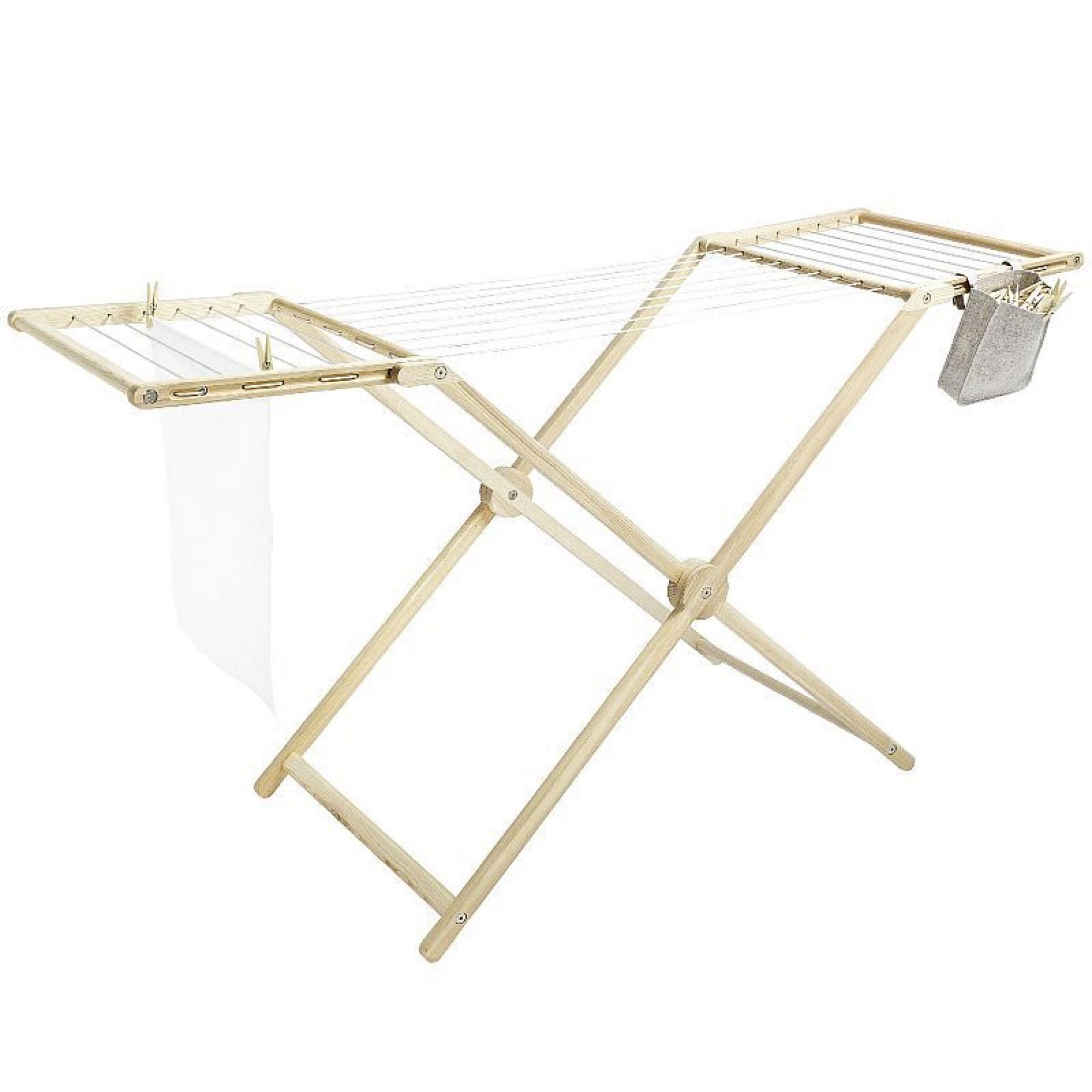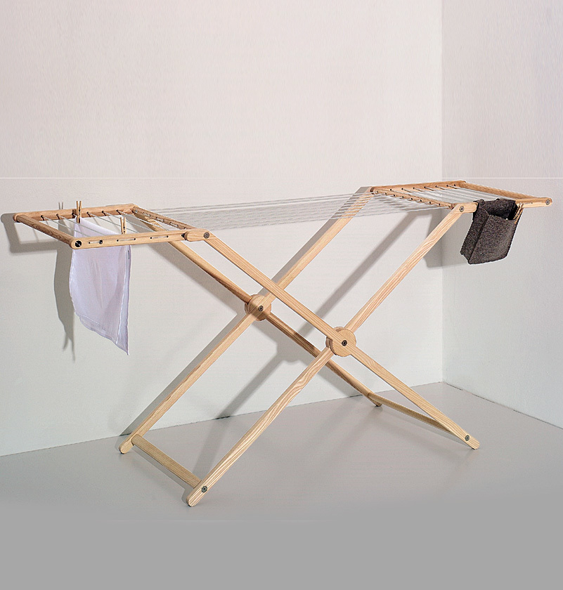 Nach Gebrauch kann er zusammengeklappt werden und findet so auch auf kleinstem Raum Platz. Ihre Wäsche trocknet auf verstärkten Kunststoffleinen, die von einem Gestell aus massivem und unbehandeltem Eschenholz gehalten werden.