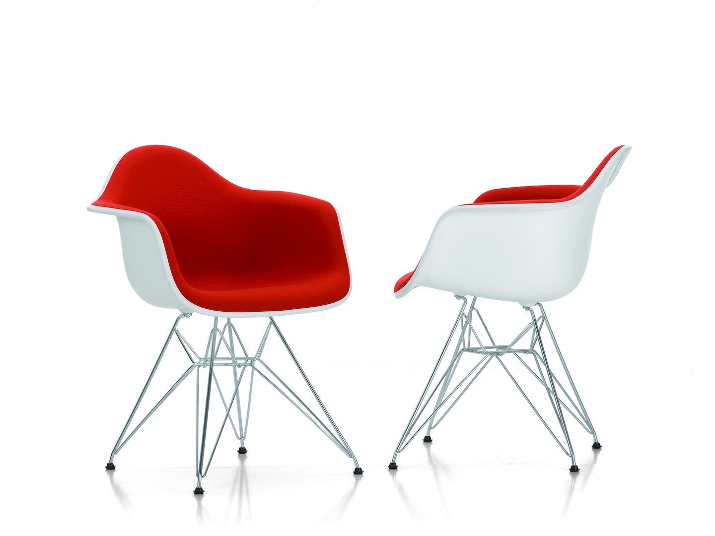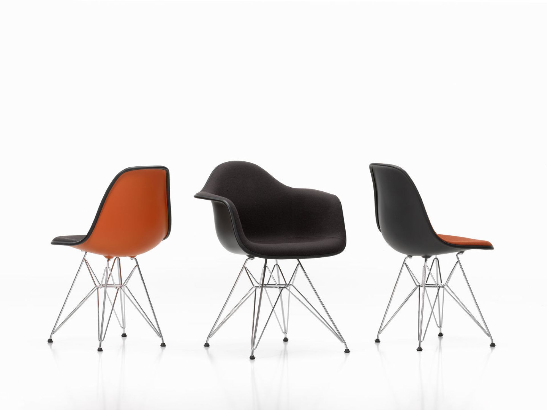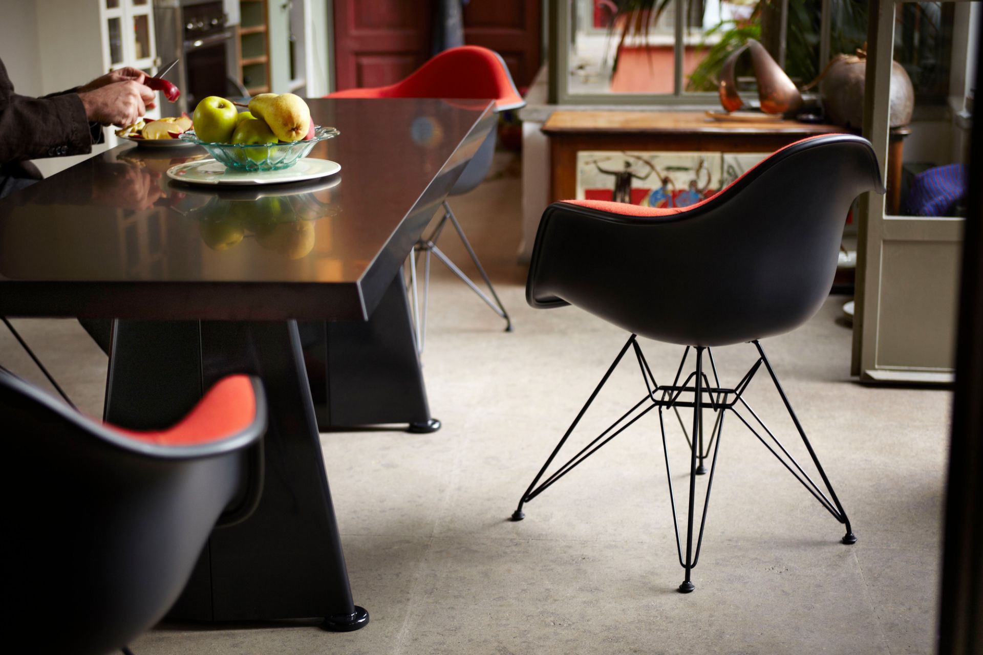 DAR steht als Abkürzung für "Dining Armchair rod base". Die filigrane Konstruktion aus Stahldraht wird auch Eiffelturm-Untergestell genannt und verbindet eine konstruktive Stabilität mit einer formalen Leichtigkeit. Die verschiedenfarbigen, organischen Sitzschalen ermöglichen es den beliebten Klassiker DAR nach den eigenen Vorlieben anzupassen.