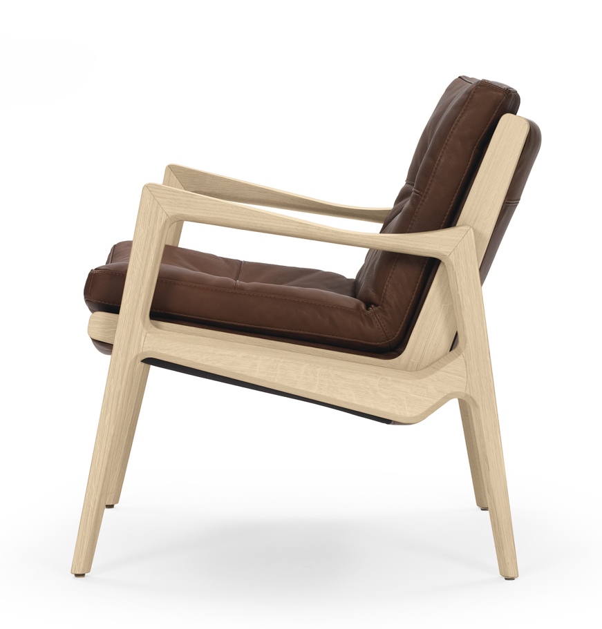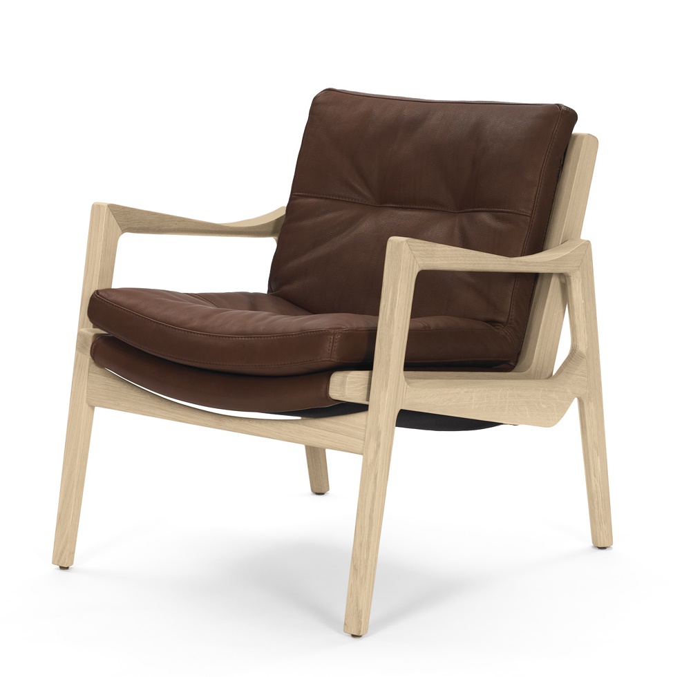 Bestellen Sie den optisch an die brasilianischen 60er und 70er Jahre angelehnten Armlehnstuhl mit Ihrem Wunschbezug und einem Gestell aus natürlichem oder braun bzw. schwarz gebeiztem Eichenholz.