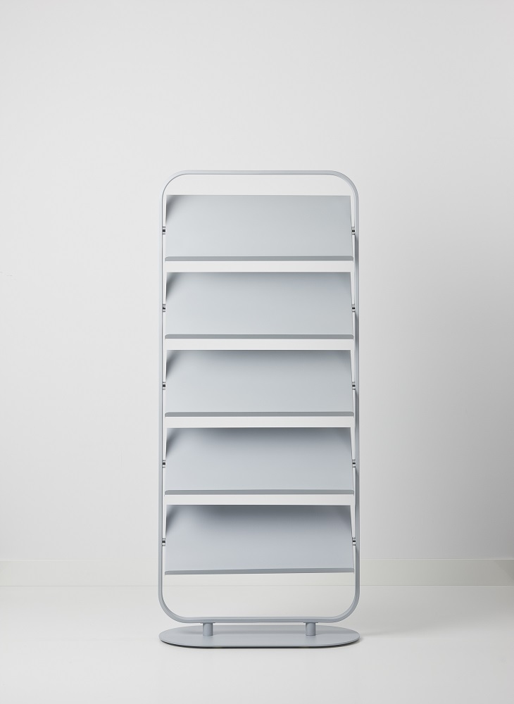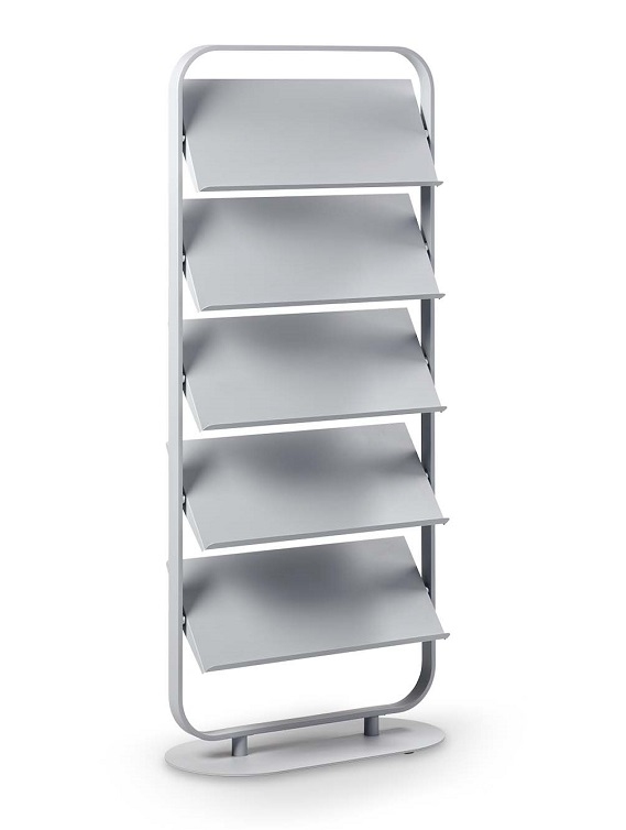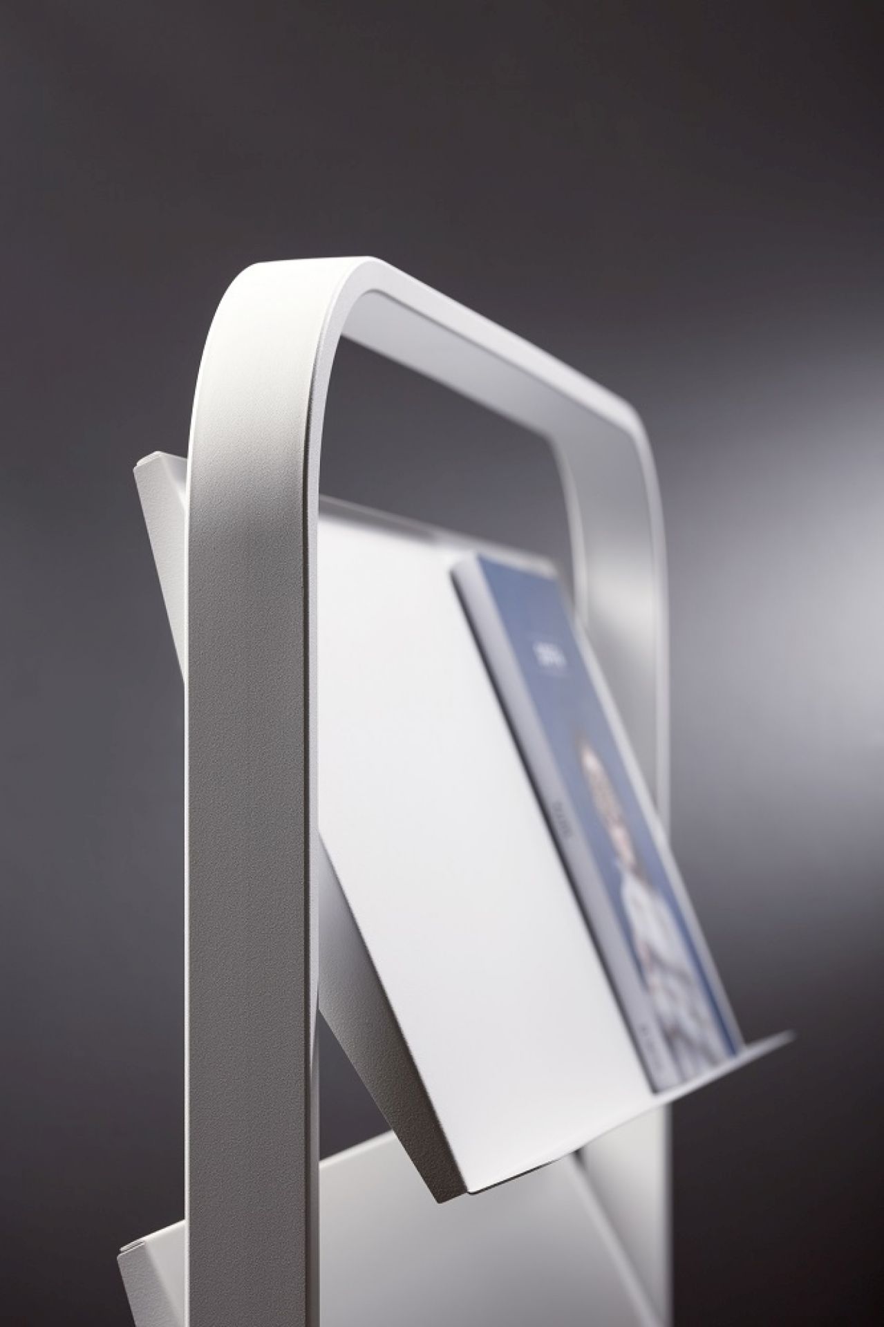 Der Focus Prospekthalter von Cascando ist durch seine abgerundete Form gekennzeichnet, die ihn sanft in die Umgebung einfügt. Er hat Regalböden, die je nach Wahl horizontal oder schräg montiert werden können und so ansprechenden Platz für Broschüren oder Bücher gleichermaßen bieten.