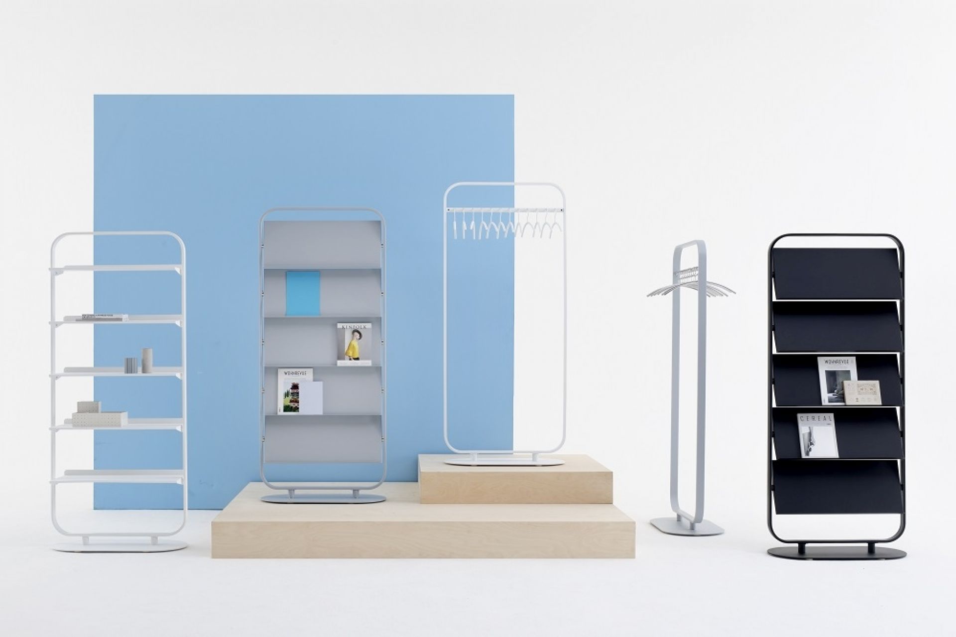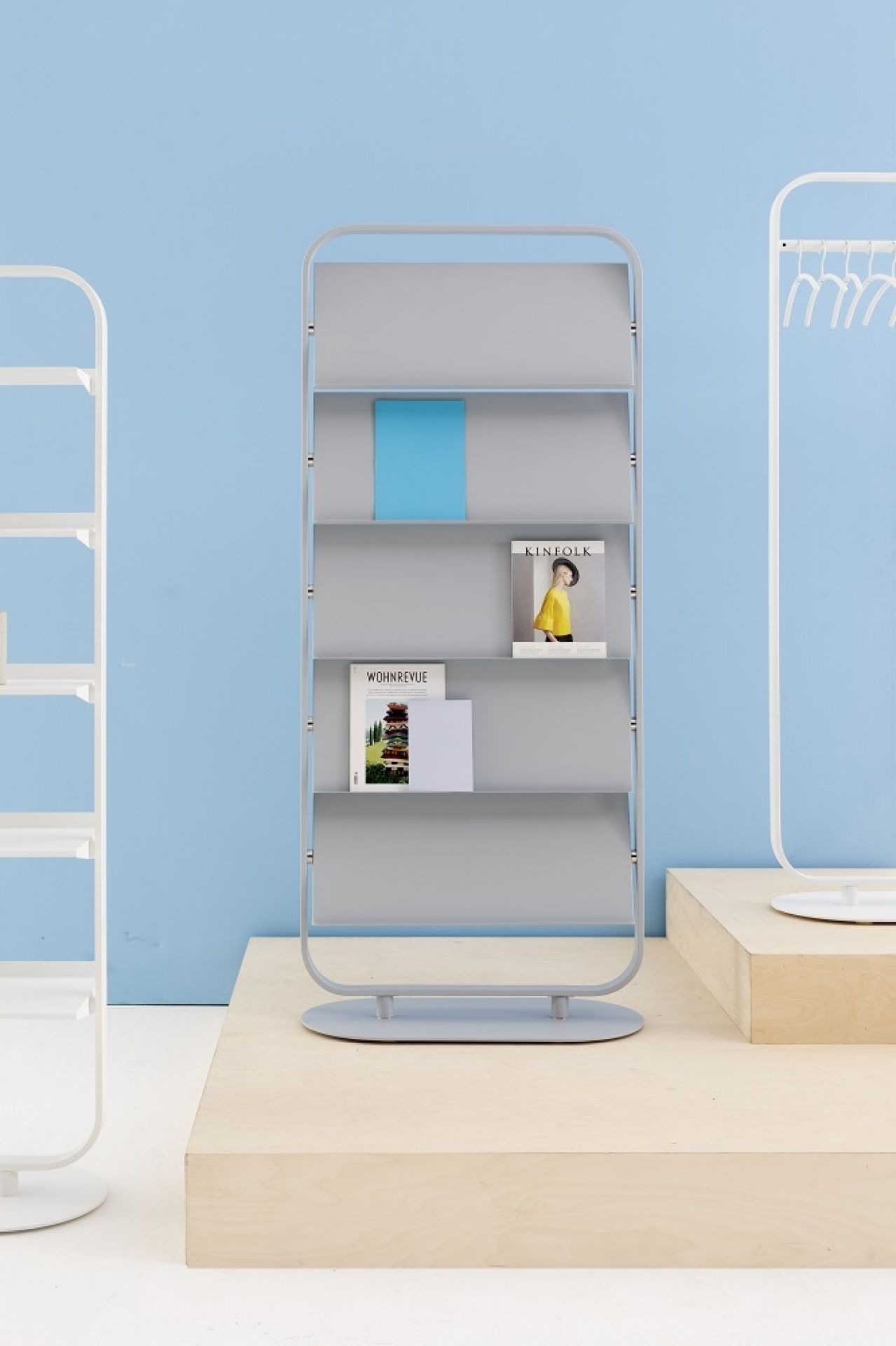 Der 50 cm breite, 40 cm tiefe und 188 cm hohe Prospekthalter ist in drei verschiedenen Farben erhältlich. Rahmen und Fuß bestehen aus pulverbeschichtetem Stahl.