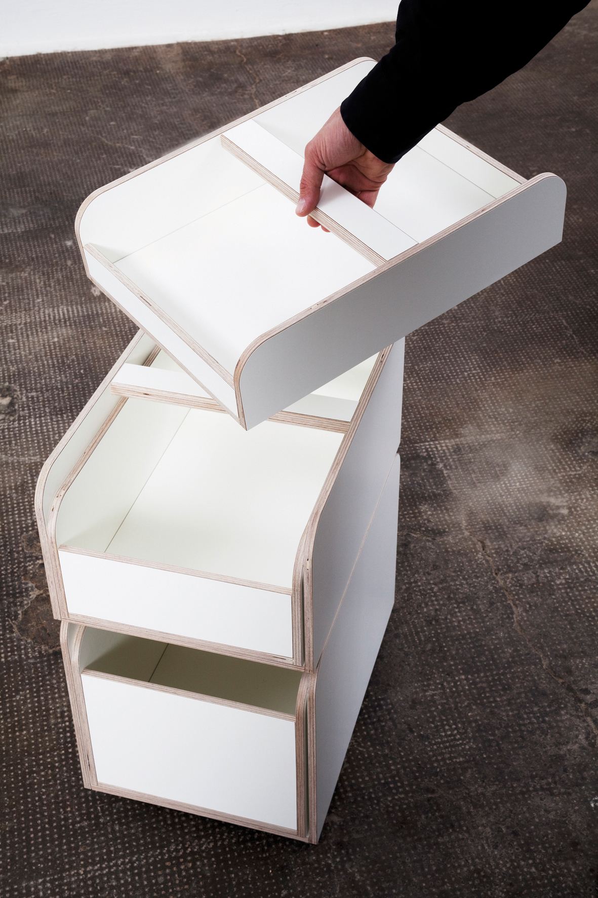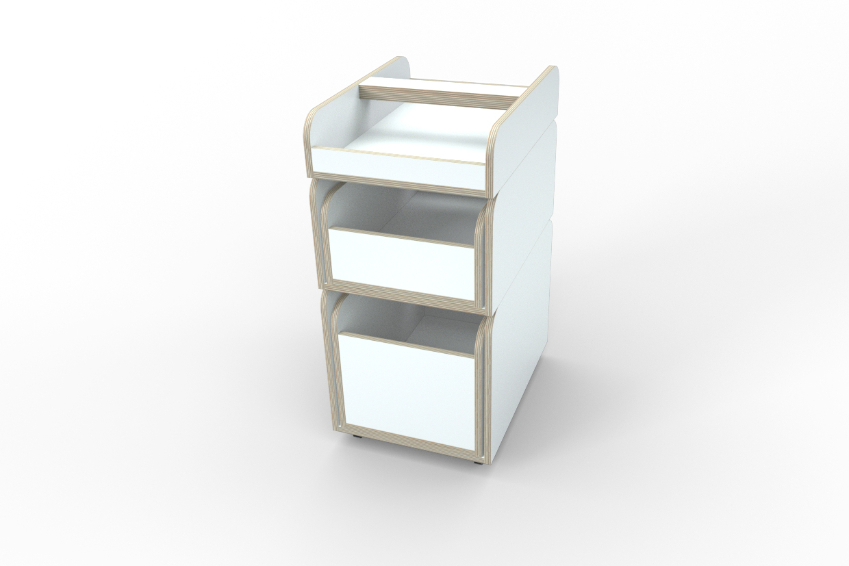 Der Container ist aus Birkenholz mit weißer HPL-Beschichtung gefertigt. Er ist 31 cm breit, 42 cm tief und 62 cm hoch. Es handelt sich um drei stapelbare Volumen mit Tragegriff von denen zwei über eine Schublade verfügen und vier Lenkrollen am unteren Volumen.